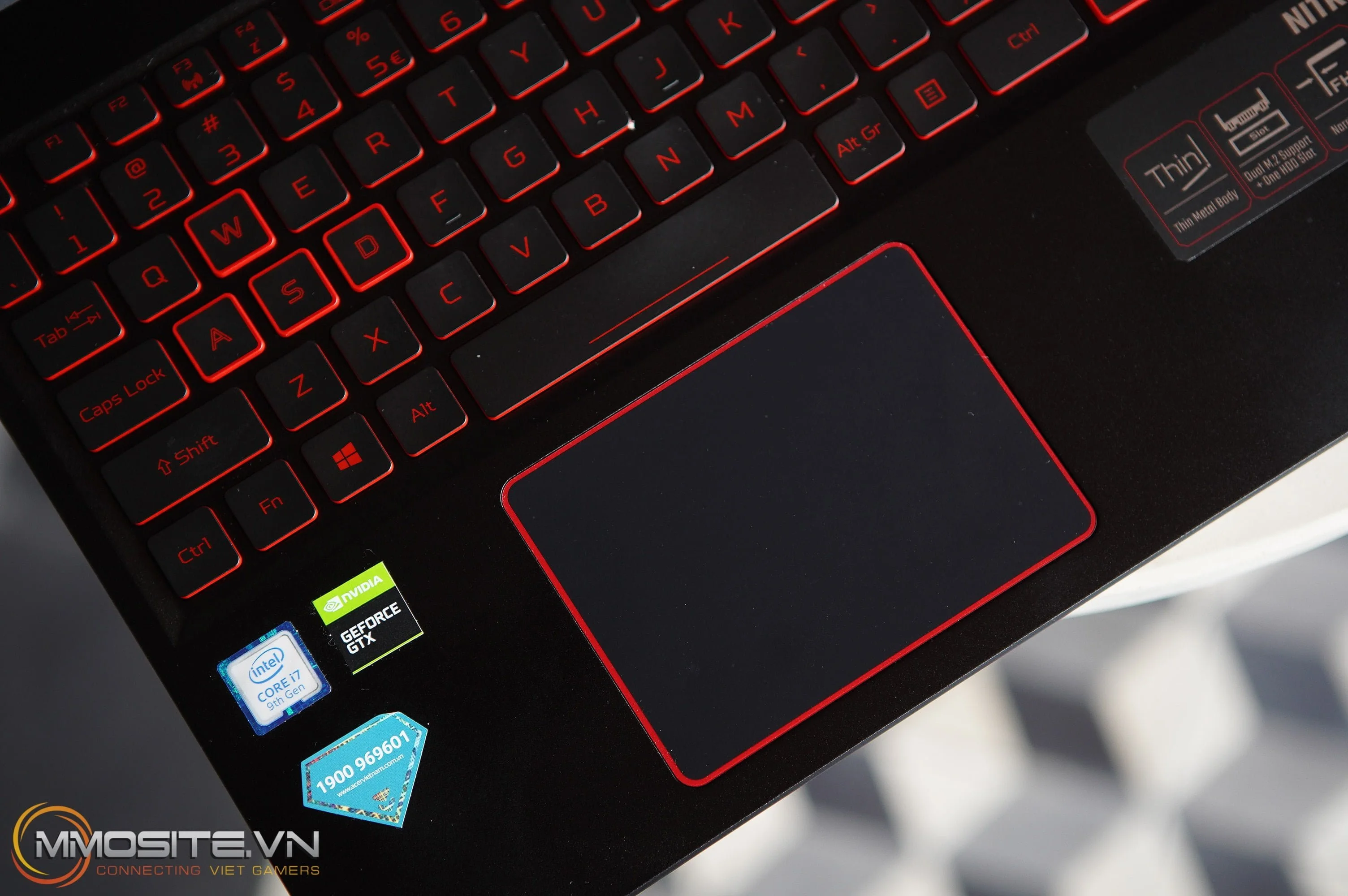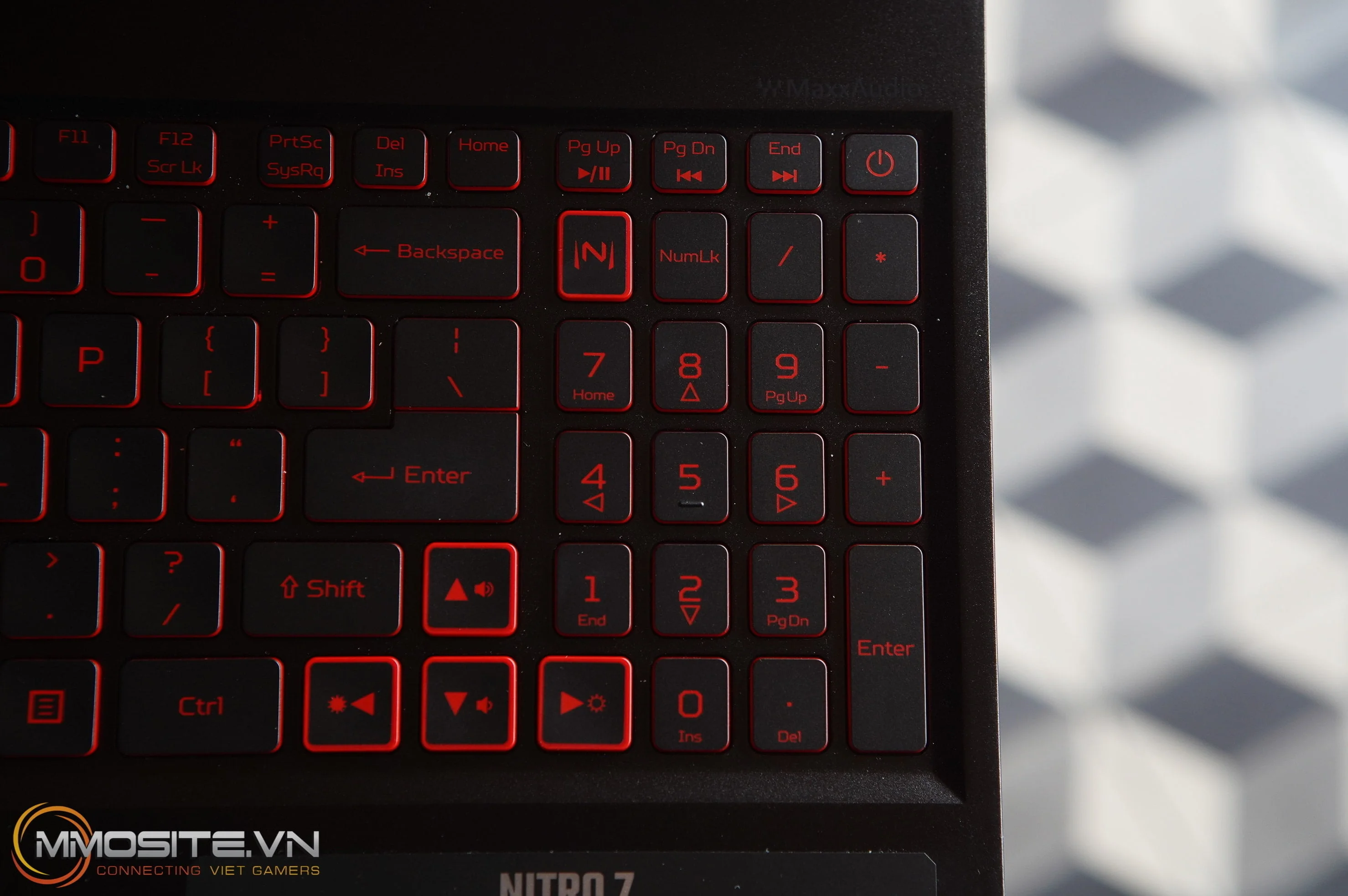 Những chi tiết còn lại, Acer Nitro 7 cũng mang đậm chất game thủ với tông màu đỏ đen. Từ khu vực bàn phím với legend key màu đỏ kết hợp với cụm phím arrow và WASD được nhấn, viền touchpad màu đỏ, lấp ló khối heat sink màu đỏ phía bên trong máy. Tất cả đều đem lại cảm giác “nóng máu” khi lần đầu tiên thấy Nitro 7, nhưng cũng có thể coi đây là một điểm yếu khi Nitro 7 sẽ lẫn vào thế giới gaming laptop trước giờ toàn sử dụng tông màu đỏ đen.
