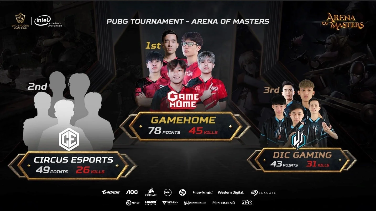 Sau 6 ngày vòng loại và một ngày chung kết vô cùng sôi nổi và căng thẳng, giải đấu PUBG – Arena of Master do Intel và các đối tác AOC, Corsair, Dell, Gigabyte, HP, Seagate, Western Digital, ViewSonic tổ chức, đã tìm ra nhà vô địch mùa này: GAMEHOME ESPORTS.