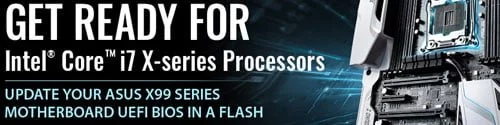 Nếu đang sở hữu một bo mạch chủ ASUS X99 và có ý định sử dụng các bộ vi xử lý Intel Core i7 X-Series hoặc Intel Xeon sắp ra mắt, người dùng có thể truy cập vào trang chủ của ASUS(www.asus.com) và tải về các bản cập nhật BIOS mới nhất ngay hôm nay. Danh sách các dòng bo mạch chủ ASUS X99 Series được hỗ trợ cũng được cung câp tại địa chỉhttp://www.asus.com/Microsite/mb/intel-core-i7-x-series-cpu-ready
