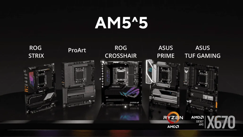 Những thay đổi quan trọng đối với CPU và chipset của AMD cho phép ASUS biến X670 thực sự trở thành một nền tảng thế hệ tiếp theo. Được chế tạo trên tiến trình 5 nanomet tiên tiến, bộ vi xử lý AMD Ryzen 7000 được lắp vào socket AM5 hoàn toàn mới. Là một socket kiểu LGA, các chân cắm nằm trên bo mạch chủ, không phải CPU, nên ít có khả năng bị bẻ cong hoặc hư hỏng chân cắm một cách ngẫu nhiên. AM5 hỗ trợ công suất toả nhiệt (TDP) lên đến 170 watt, cho phép hiệu suất tính toán vượt trội ở các công việc có lượng tải nặng hơn trên các CPU có số lượng lõi nhiều.