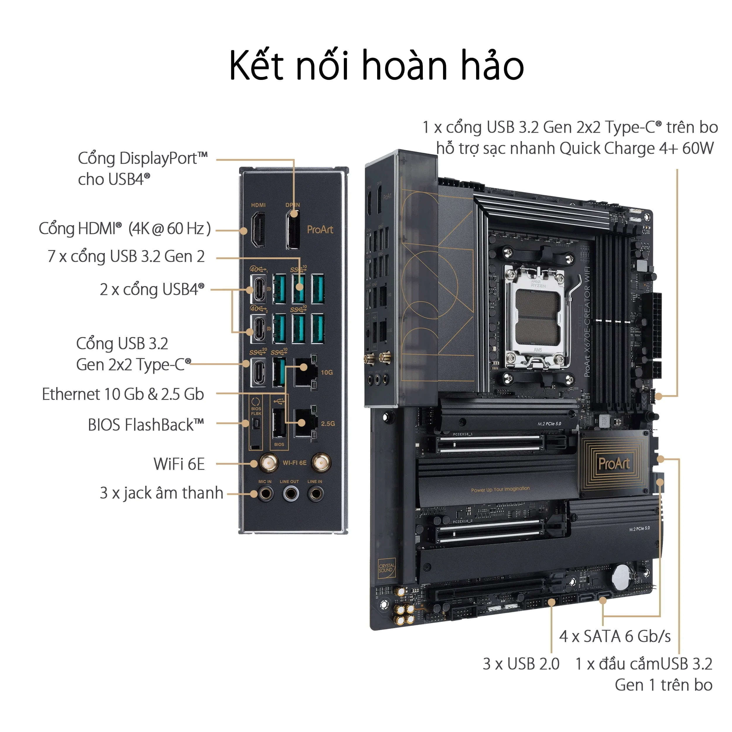 Mỗi người cũng sẽ tìm thấy sự lựa chọn toàn diện về các cổng tốc độ cao được thiết kế để kết nối tới một máy trạm sáng tạo hoàn chỉnh. Giao thức PCIe 5.0 mới cung cấp đủ băng thông cho một cặp cổng USB4 trên mặt giao tiếp I/O phía sau. Khả năng kết nối linh hoạt ở mặt trước là điều cần thiết cho nhiều quy trình làm việc, vì vậy ProArt X670E-Creator WiFi cung cấp đầu nối USB 3.2 Gen 2×2 Type-C ở mặt trước với hỗ trợ Quick Charge 4+. Kết hợp điều này với vỏ thùng máy có cổng USB Type-C ở mặt trước giúp bạn có thể cung cấp nguồn sạc lên tới 60W.