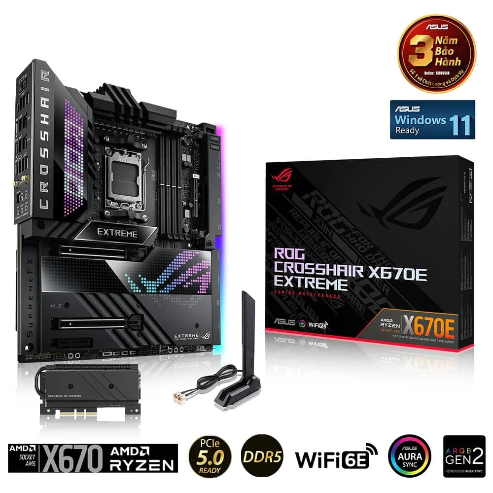 ROG Crosshair X670E Extreme chính là bo mạch chủ tối thượng với các đường nét góc cạnh, các điểm nhấn đèn LED RGB sống động và tông màu đen huyền bí, xứng đáng ở vị trí trung tâm trong một dàn máy gaming cao cấp thế hệ mới. Với các tùy chọn cá nhân hóa chưa từng có, bo mạch này có tích hợp màn hình AniMe Matrix – một dãy đèn LED có thể hiển thị các hoạt ảnh theo phong cách mà bạn yêu thích.