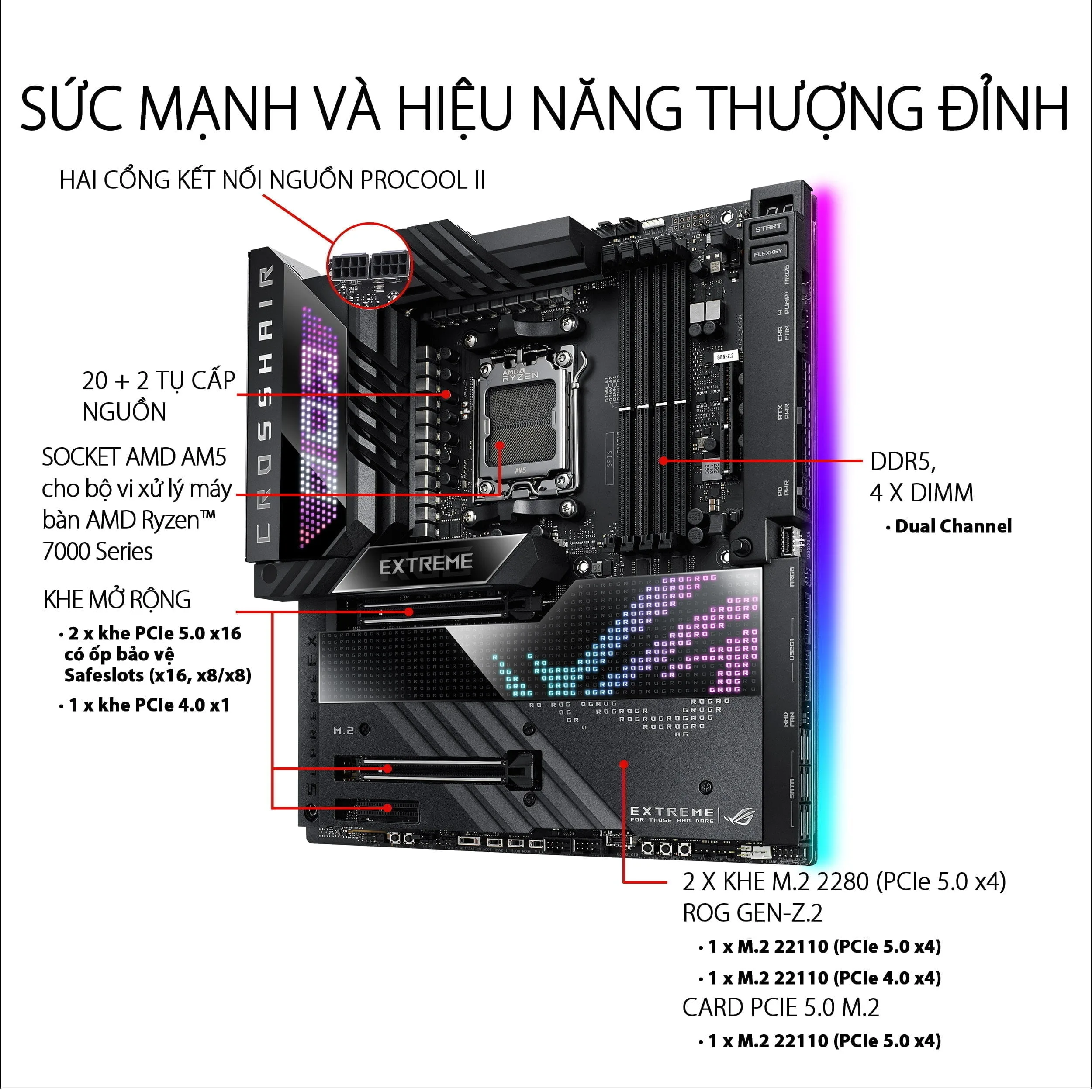 Nền tảng X670 thế hệ mới này hoàn toàn cho phép người dùng nâng cấp trải nghiệm chơi game lên gấp 5 lần với chuẩn PCIe 5.0 và DDR5. Khe cắm PCIe 5.0 x16 của nó có thể tương thích với card đồ họa nhanh nhất hiện nay và ở tương lại, đồng thời hỗ trợ DDR5 cho phép người dùng tận hưởng băng thông lớn, tốc độ ở mức chóng mặt, nhưng sử dụng năng lượng đặc biệt hiệu quả do RAM DDR5 thế hệ mới cung cấp. Giữa các khe cắm trên bo mạch và card ROG Gen-Z.2, Gene cung cấp hai khe cắm M2 chuẩn PCIe 5.0 và một khe cắm M2 chuẩn PCIe 4.0, mang lại không gian rộng rãi để xây dựng thư viện các trò chơi với tốc độ truy xuất cực nhanh. Và tất nhiên, bo mạch chủ này được chế tạo cho ngay cả những bộ vi xử lý AMD Ryzen 7000 mạnh nhất khi trang bị dàn VRM với 16 + 2 pha cấp điện SPS 110 ampe theo cấu trúc cấp điện song song.
