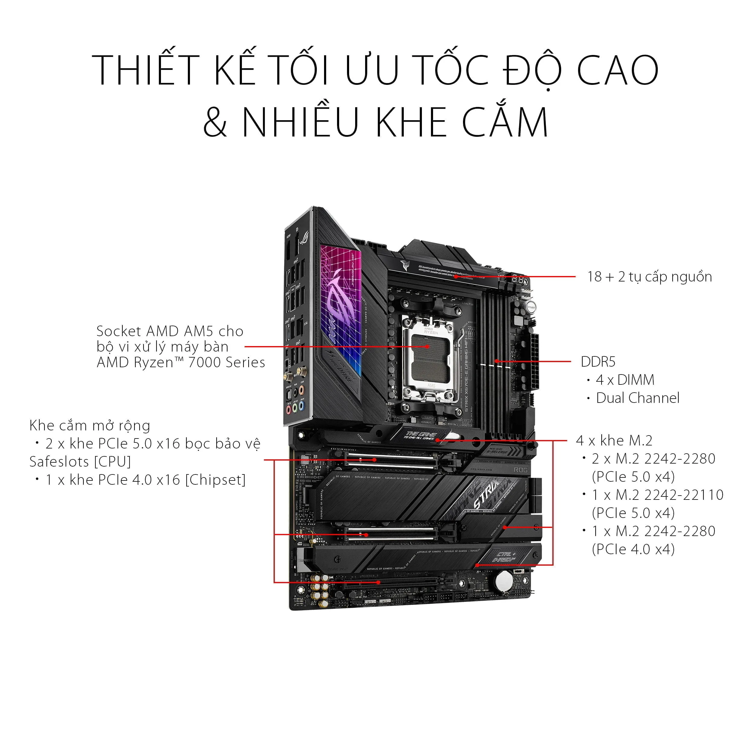 Các giải pháp toàn diện về tản nhiệt và cấp điện giúp người dùng có thể chế ngự các thiết bị cao cấp nhất. Dàn VRM với 18 + 2 pha điện SPS 110 ampe được bố trí theo tầng cấp điện song song cung cấp dòng điện ổn định cho CPU AMD. Hai khe cắm PCIe 5.0 x16 dành cho các card đồ họa và card mở rộng thế hệ mới nhất. Để giữ cho ổ SSD PCIe 5.0 hoạt động trơn tru tấm ốp tản nhiệt M.2 dày và có diện tích bề mặt lớn để làm mát nhanh hơn. Và tặng kèm sẵn một bộ tản nhiệt M.2 đồ sộ trong bộ phụ kiện.