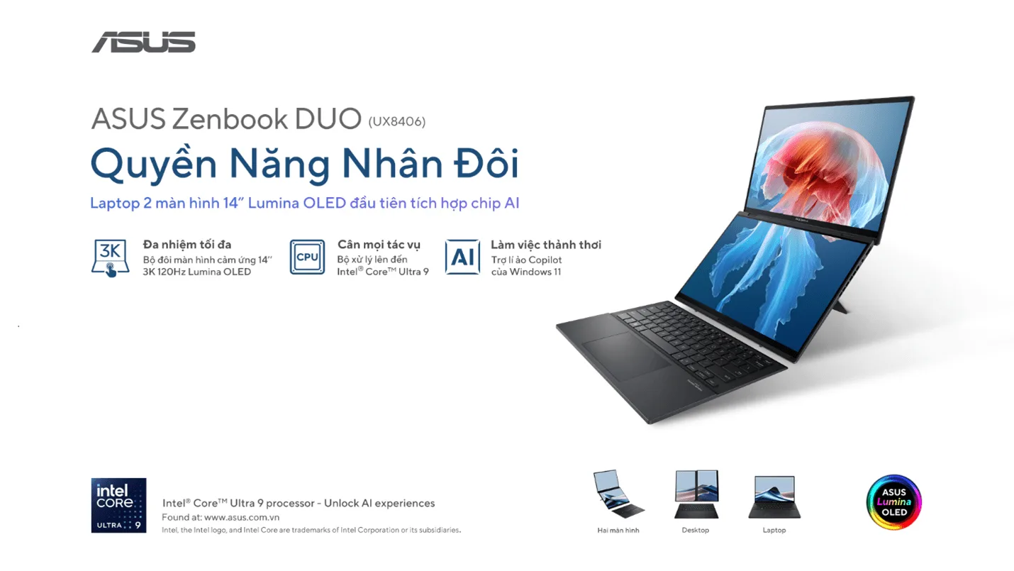 Zenbook DUO – Laptop 2 màn hình 14″ Lumina OLED tích hợp chip AI: sở hữu 2 màn hình cảm ứng độ phân giải 3K, tần số quét 120Hz, tỷ lệ 16:10 cùng trọng lượng chỉ 1.35 kg mở rộng không gian làm việc nhưng vẫn gọn nhẹ, siêu di động. Đây là dòng laptop tối ưu cho làm việc đa nhiệm với nhiều chế độ sử dụng như laptop thông thường, màn hình kép, máy tính để bàn. Zenbook DUO tích hợp chip AI cho hiệu năng vượt trội với bộ vi xử lý lên đến Intel Core Ultra 9 tăng cường hiệu năng nhờ chip AI tích hợp cùng Windows Copilot nâng cao hiệu suất làm việc cho người dùng. Sản phẩm có giá từ 49.99 triệu đồng.