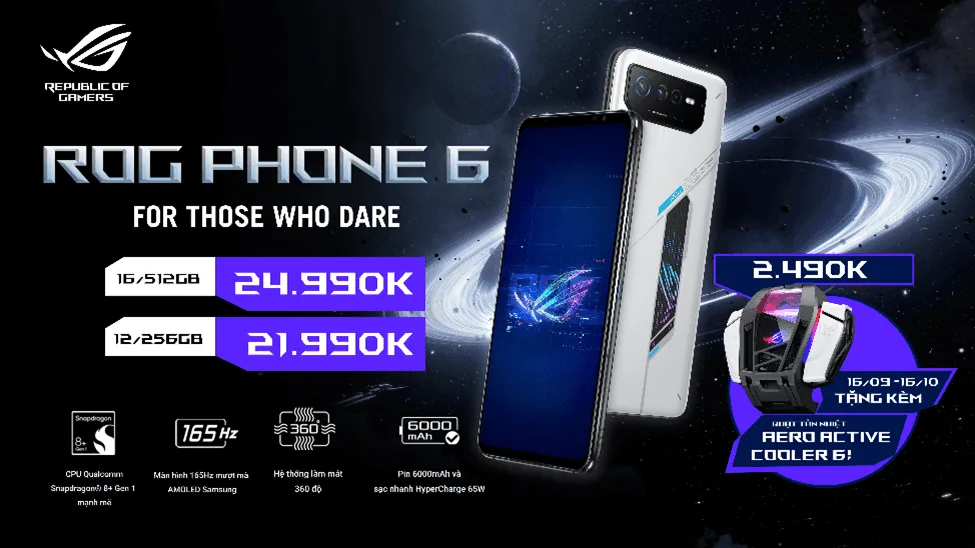 Đặc biệt, người dùng sẽ nhận về ngay 1 quạt tản nhiệt AeroActive Cooler 6 trị giá 2,490,000 khi mua ROG Phone 6 từ 16/09 – 16/10.