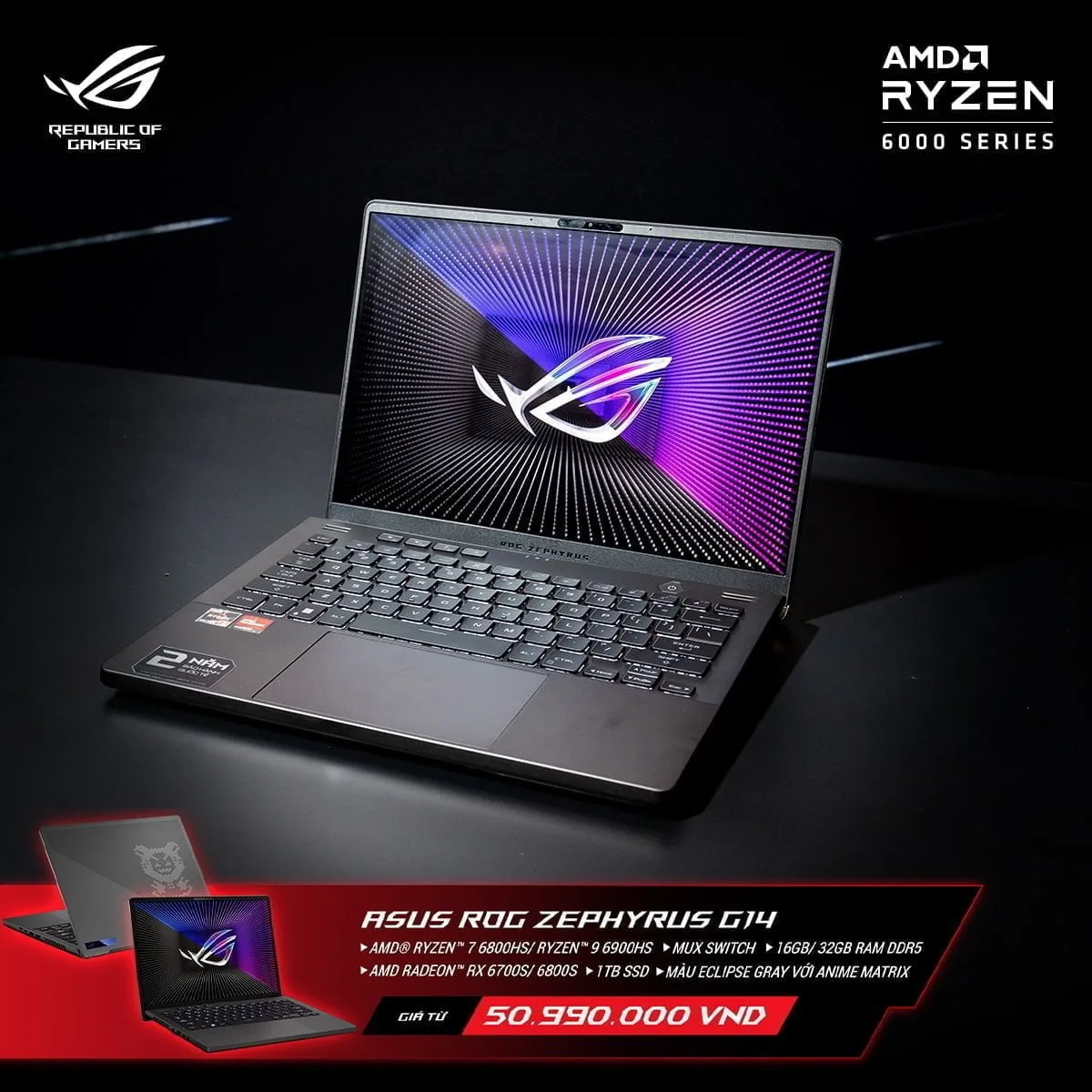 Dòng sản phẩm ROG Zephyrus G14 chính là hoa khôi của thương hiệu ROG nhờ thiết kế đầy phong cách, kích thước nhỏ gọn mà vẫn sở hữu cấu hình cực đỉnh. Với phiên bản nâng cấp trong năm 2022, ROG Zephyrus G14 sẽ được tăng lực nhờ hệ điều hành Windows 11 cài sẵn, vi xử lý AMD Ryzen 9 Series và card đồ họa AMD Radeon RX 6000S Series với tính năng MUX Switch đi kèm, cho hiệu năng tối ưu theo nhu cầu của người dùng. Hệ thống tản nhiệt thông minh ROG Intelligent Cooling với keo tản nhiệt kim loại lỏng và tản nhiệt buồng hơi giúp đảm bảo hiệu năng tuyệt vời trong thời gian dài sử dụng, đi kèm RAM DDR5 và SSD PCIe 1TB cho tốc độ tải ứng dụng cực nhanh và tối ưu khi xử lý đa tác