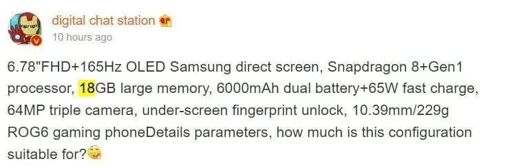 Đối với các thông số kỹ thuật khác, giới leaker tuyên bố rằng ROG Phone 6 sẽ nặng 229 gram và có độ dày 10,39 mm, khiến nó trở thành một chiếc flagship khá cồng kềnh khi những chiếc điện thoại thời nay đang có xu hướng mỏng nhẹ. Tuy nhiên, bạn phải lưu ý rằng chiếc điện thoại mới này sẽ có viên pin lớn hơn và một trailer trước đó từ ASUS đã tiết lộ rằng chiếc điện thoại này sẽ có khoang chứa hơi lớn hơn 30%, điều này chắc chắn sẽ khiến chiếc điện thoại dày hơn.