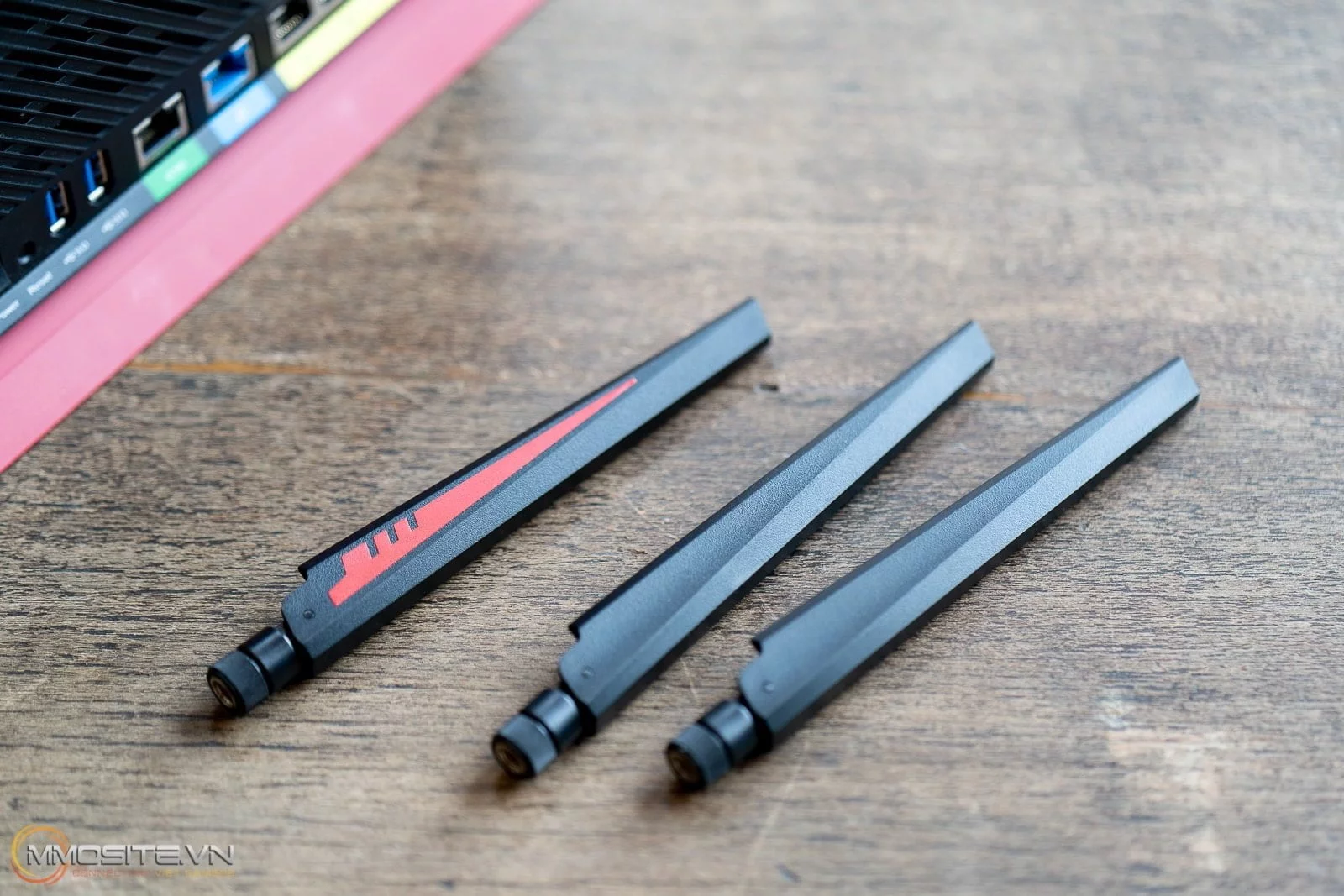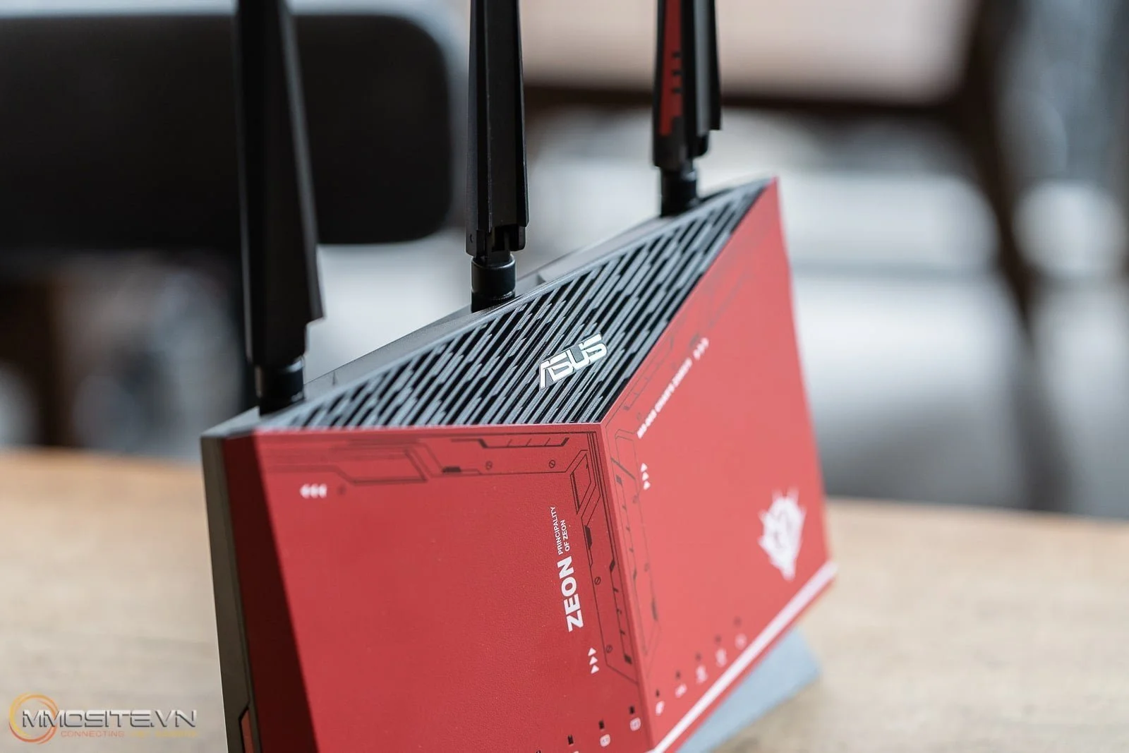 RT-AX86U Zaku II Edition có thiết kế 3 ăn ten với góc điều hướng linh hoạt và hoàn toàn có thể tách rời. Trên thực tế, mẫu router này có tổng cộng 4 ăn ten, trong đó có 1 ăn ten ngầm.