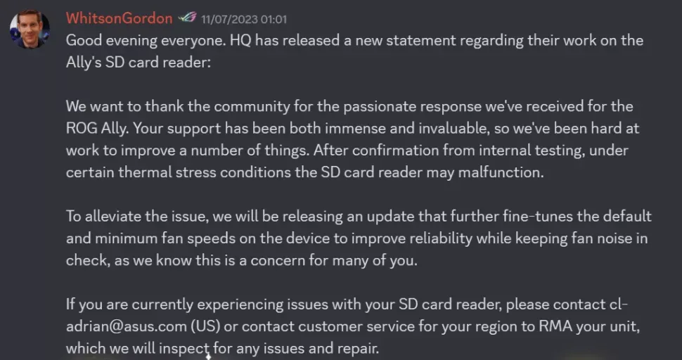“Sau khi xác nhận từ các bài thử nghiệm nội bộ, trong một số điều kiện khắc nghiệt nhất định, đầu đọc thẻ SD có thể gặp trục trặc”, đại diện của Asus đã nói trên Republic of Gamers Discord (thông qua Tom’s Hardware).