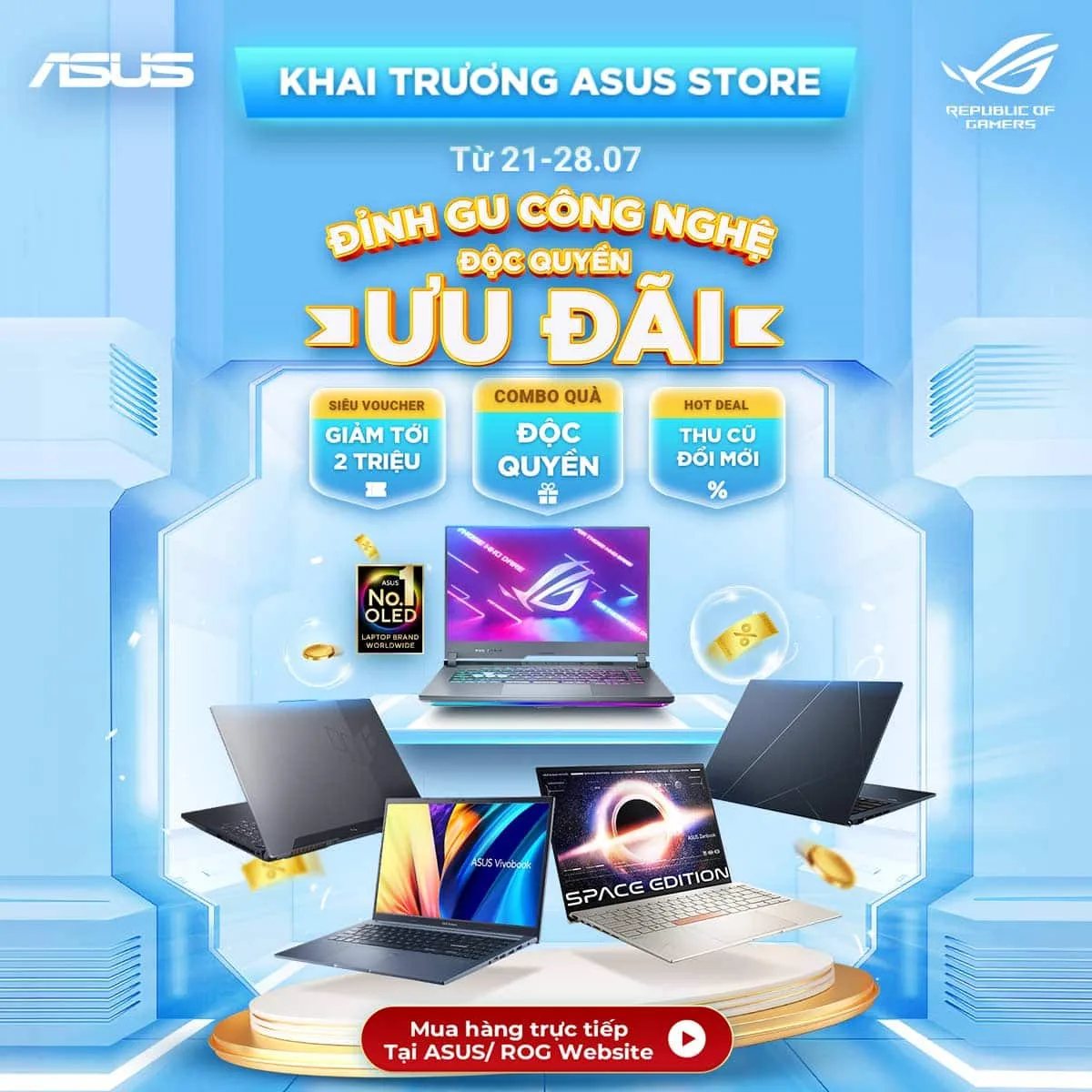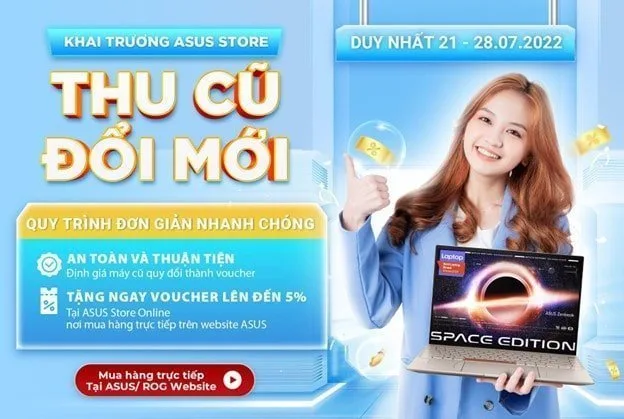 - Chương trình ‘Thu máy cũ, nâng đời máy mới “, tặng ngay voucher lên đến 5% khi lên mua máy mới tại ASUS Store.
