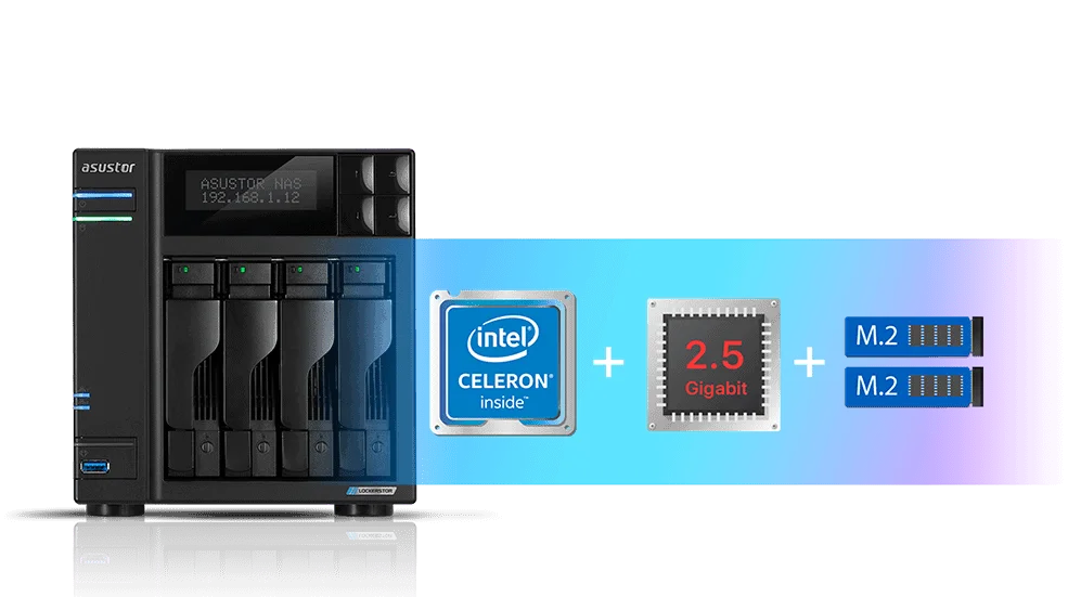 Về hiệu năng, ASUS trang bị cho chiếc NAS của mình vi xử lí Intel 4 nhân và khả năng nâng cấp RAM dễ dàng. Tất nhiên vì đây là sản phẩm hướng đến đối tượng người dùng doanh nghiệp nên ASUS đã dùng một lựa chọn hợp lí là 2 cổng LAND 2.5GbE thay vì 4 cổng 1GbE, mang lại tiềm năng tổng hợp 5Gbps khi được sử dụng với một switch phù hợp.