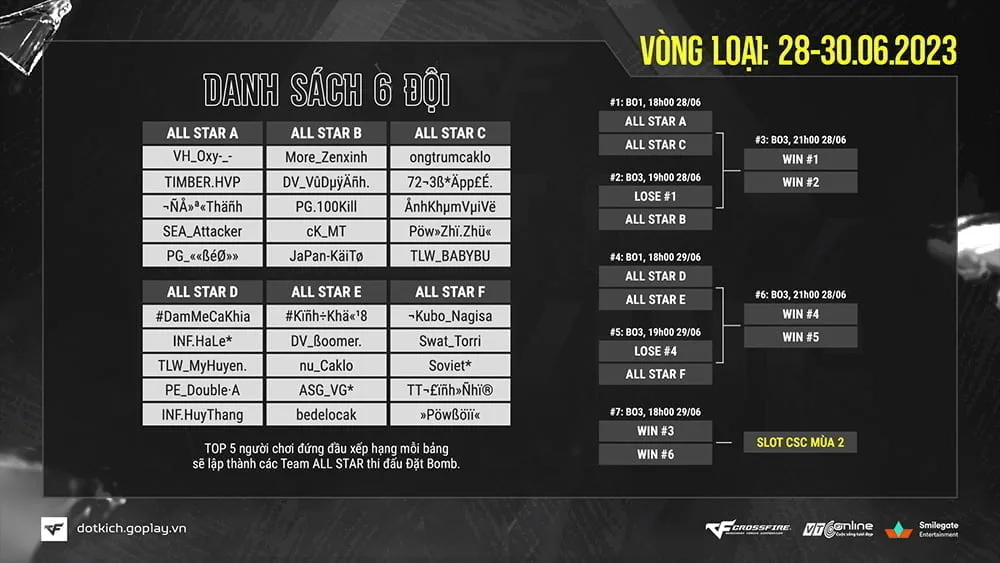 Ngày 30/6 là thời khắc quyết định khi 2 đội dẫn đầu là All Star B và All Star F bắt đầu thi đấu tranh vé duy nhất tham gia giải đấu bán chuyên CSC 2023 mùa 2. Với lợi thế được cấm/chọn trước trong lượt BO3 và có sự góp mặt của những hảo thủ từng tham gia thi đấu tại giải chuyên nghiệp CFVL, đội All Star F có lợi thế cao hơn. Họ đã giành được chiến thắng 10-2 tại map đấu quốc dân là Trạm Phát Sóng.