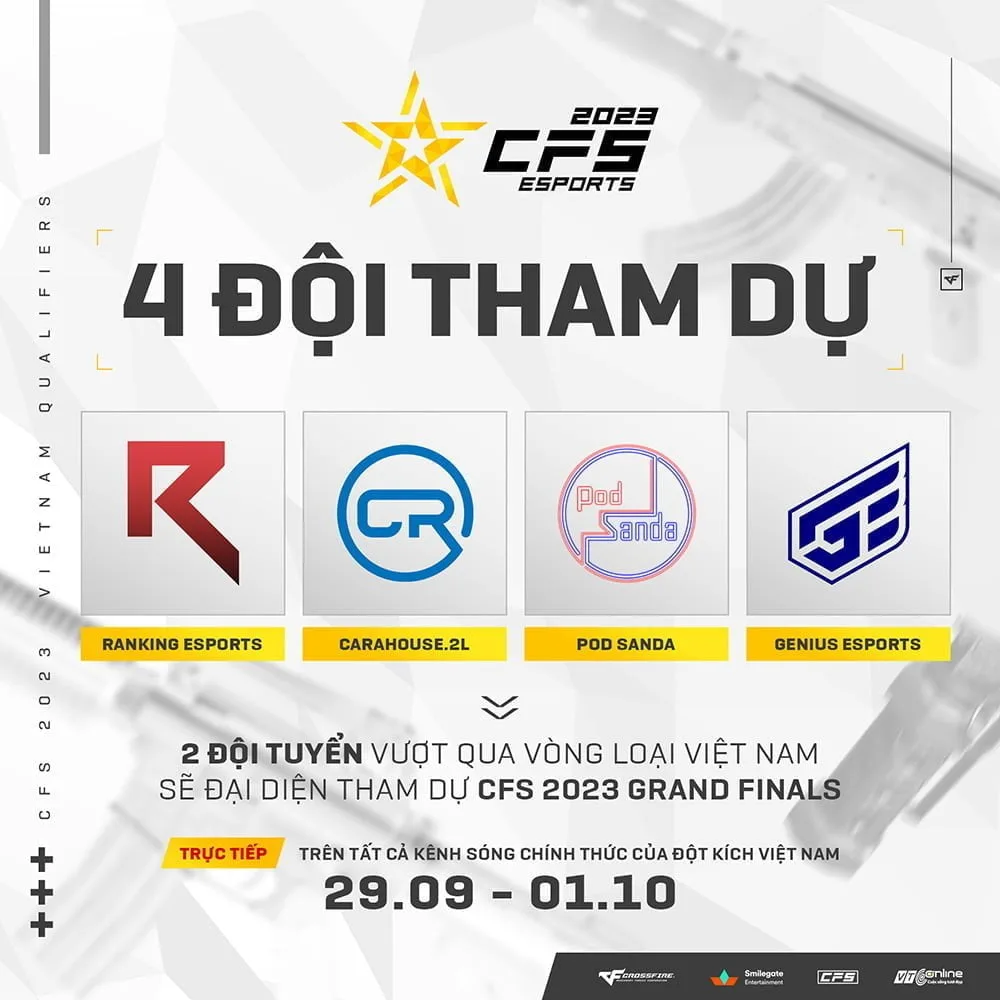Trong đợt tuyển chọn lần này, 4 đội trụ hạng thành công tại CFVL mùa này là Ranking eSports, Carahouse Last Legends, Pod Sanda và Genius eSports sẽ cùng nhau giành 2 suất đại diện Việt Nam đến góp mặt tại CFS 2023 Grand Finals.