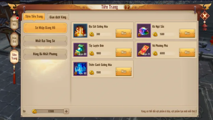 Trong bản cập nhật này, Tiệm Điền Trang chắc chắn sẽ đem đến cho người chơi vô vàn trải nghiệm mua sắm thú vị. Tiệm Điền Trang cũng giống như Tiệm Bạc hay Thần Bí sẽ giúp người có thể dễ dàng tìm kiếm được các vật phẩm như Bùa Tăng Đá, Ngọc Ảo Hình và điều đặc biệt nhất là người chơi có thể sử dụng Vàng để đổi lấy các trang bị quý báu này. Trong Tiền Trang, game thủ có thể đổi Nguyên Bảo thành Vàng, cũng có thể dùng Vàng để đổi lấy Nguyên Bảo dự trữ.