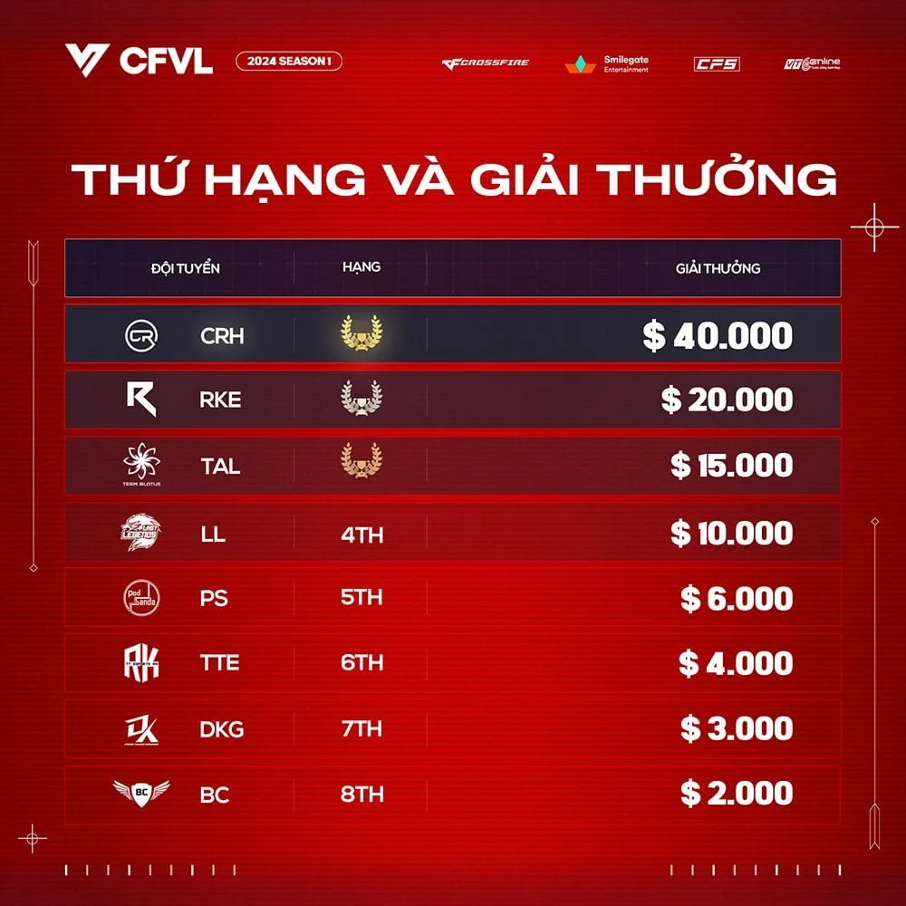 Với kết quả này, CFVL 2024 Mùa 1 khép lại với thứ hạng của 4 đội mạnh nhất như sau: