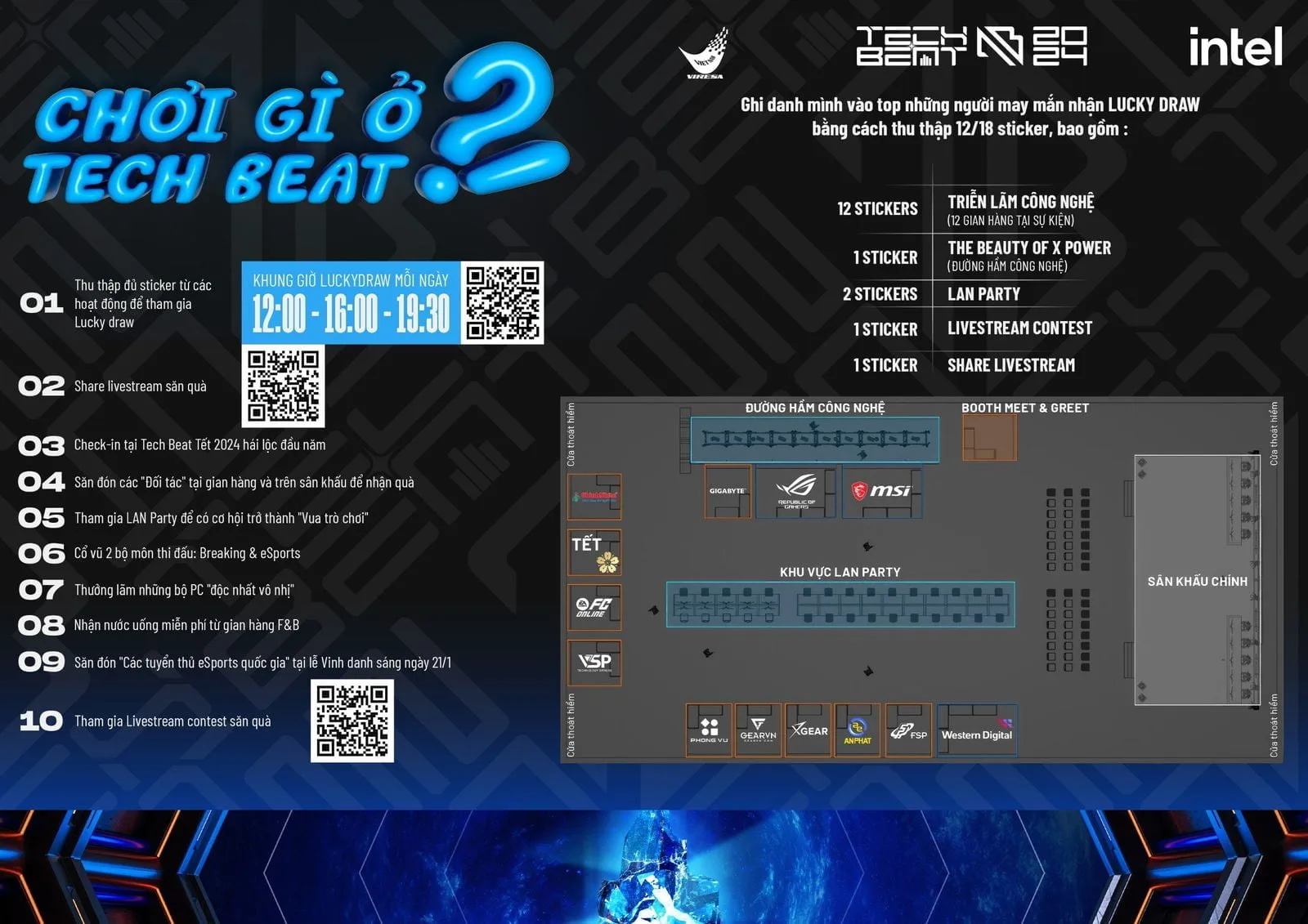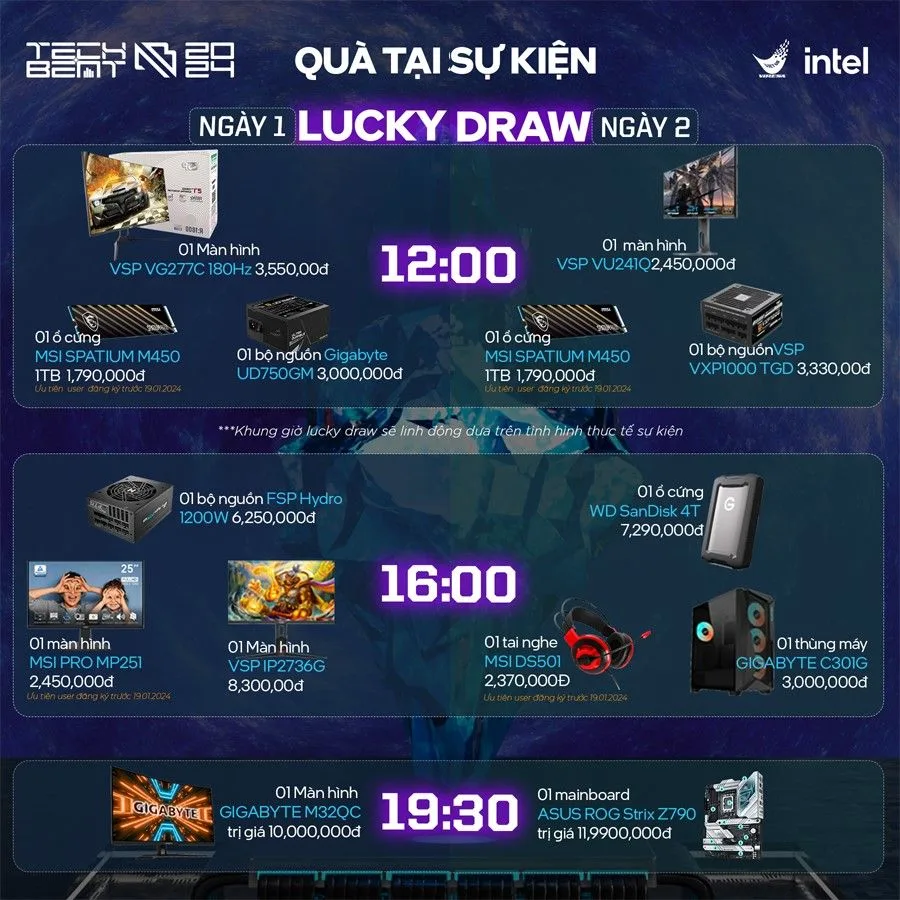 Vào các khung giờ dự kiến của sự kiện TECH BEAT 2024, hoạt động Lucky draw sẽ được diễn ra tại sân khấu chính. Các phần quà vô cùng hấp dẫn có thể kể đến như bo mạch chủ ASUS, màn hình VSP, bộ nguồn FSP, tai nghe và ổ cứng MSI, màn hình và thùng máy Gigabyte,… Các fan hâm mộ công nghệ chắc chắn không thể bỏ qua cơ hội săn quà lần này.
