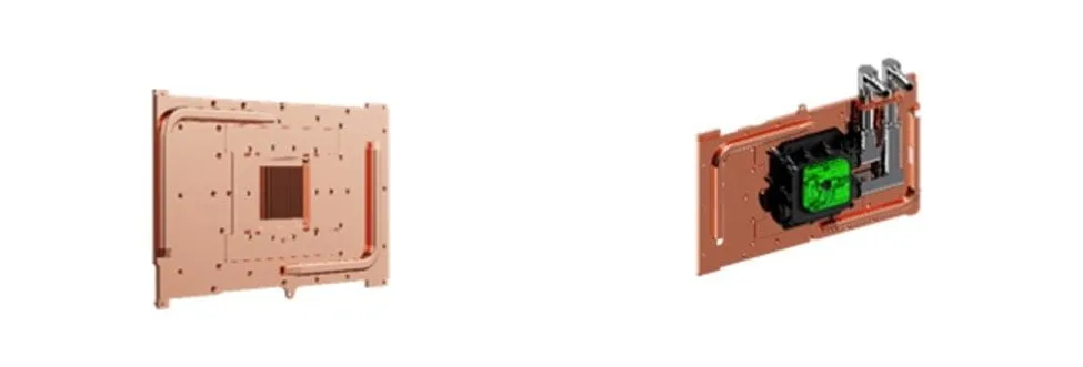 - Full-Cover Copper Waterblock: đế đồng tiết diện lớn bao phủ GPU, bộ nhớ và các thành phần quan trọng khác.