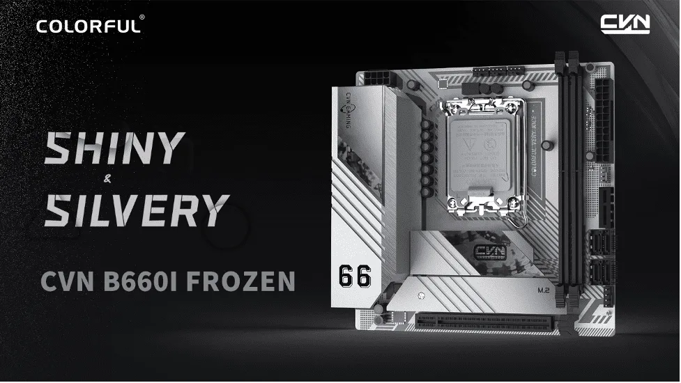 Công ty TNHH Công nghệ COLORUL, nhà cung cấp bo mạch chủ, card đồ họa, máy tính chơi game all-in-one và các giải pháp giải trí đa phương tiện, thiết bị lưu trữ chuyên nghiệp, trân trọng được ra mắt bo mạch chủ CVN B660I GAMING FROZEN và CVN B660I GAMING, dòng bo mạch chủ Mini-ITX mới nhất vừa được bổ sung vào dãy sản phẩm CVN Series dành cho loạt vi xử lý Intel Core thế hệ thứ 12. Bo mạch chủ GAMING FROZEN được hoàn thiện với tông màu trắng cùng với bộ tản nhiệt CNV màu bạc.