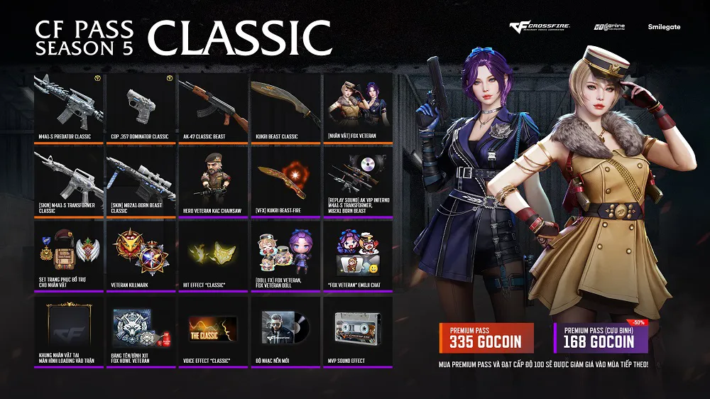 Để nhận trọn vẹn phần thưởng của CF Pass Season 5, người chơi cần mua vé Premium. Đối với các Cựu binh quay trở lại game, ưu đãi giảm 50% khi mua vé Premium CF Pass sẽ được áp dụng.