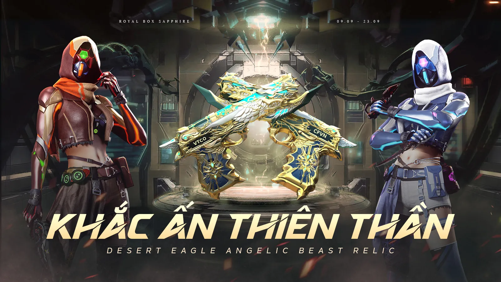 Đầu tiên, Kho Báu Hoàng Gia Sapphire Desert Eagle-Angelic Beast Relic sẽ chính thức trở lại để cung cấp món vũ khí nguyên mẫu làm nguyên liệu Khắc Ấn cho người chơi cùng nhiều phần thưởng khác. Với tỷ lệ trúng vật phẩm là 100%, game thủ có thể sở hữu hàng loạt báu vật mới cực hot mà trung tâm là M4A1-Angelic Beast-Relic với giá chỉ 15 Gocoin.