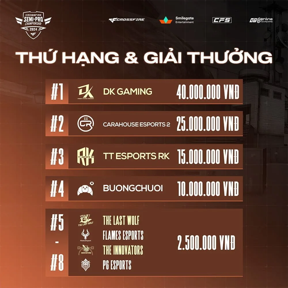 - Vô địch: DK Gaming – 40.000.000đ + 1 tấm vé thăng hạng CFVL 2024 mùa 1