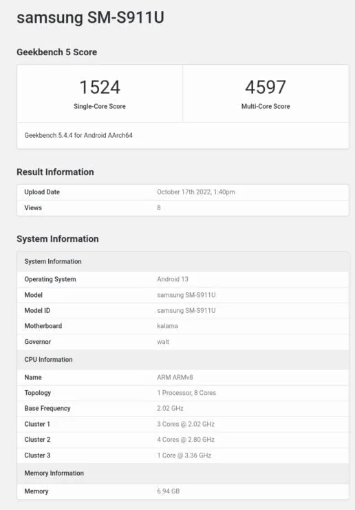Theo những gì được phát hiện trên Geekbench, Galaxy S23 đang chạy Snapdragon 8 Gen 2, có tên mã Kalama. Chipset dựa trên 8 lõi, với một lõi có tốc độ 3,36 GHz, ba lõi chạy ở tốc độ 2,02 GHz và bốn lõi chạy ở tốc độ 2,80 GHz.