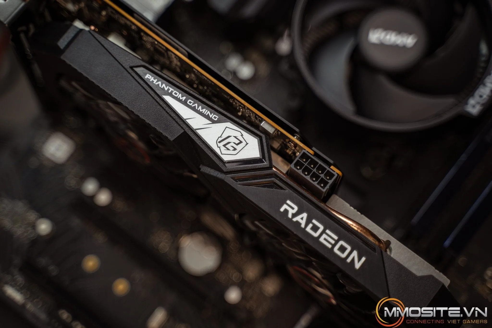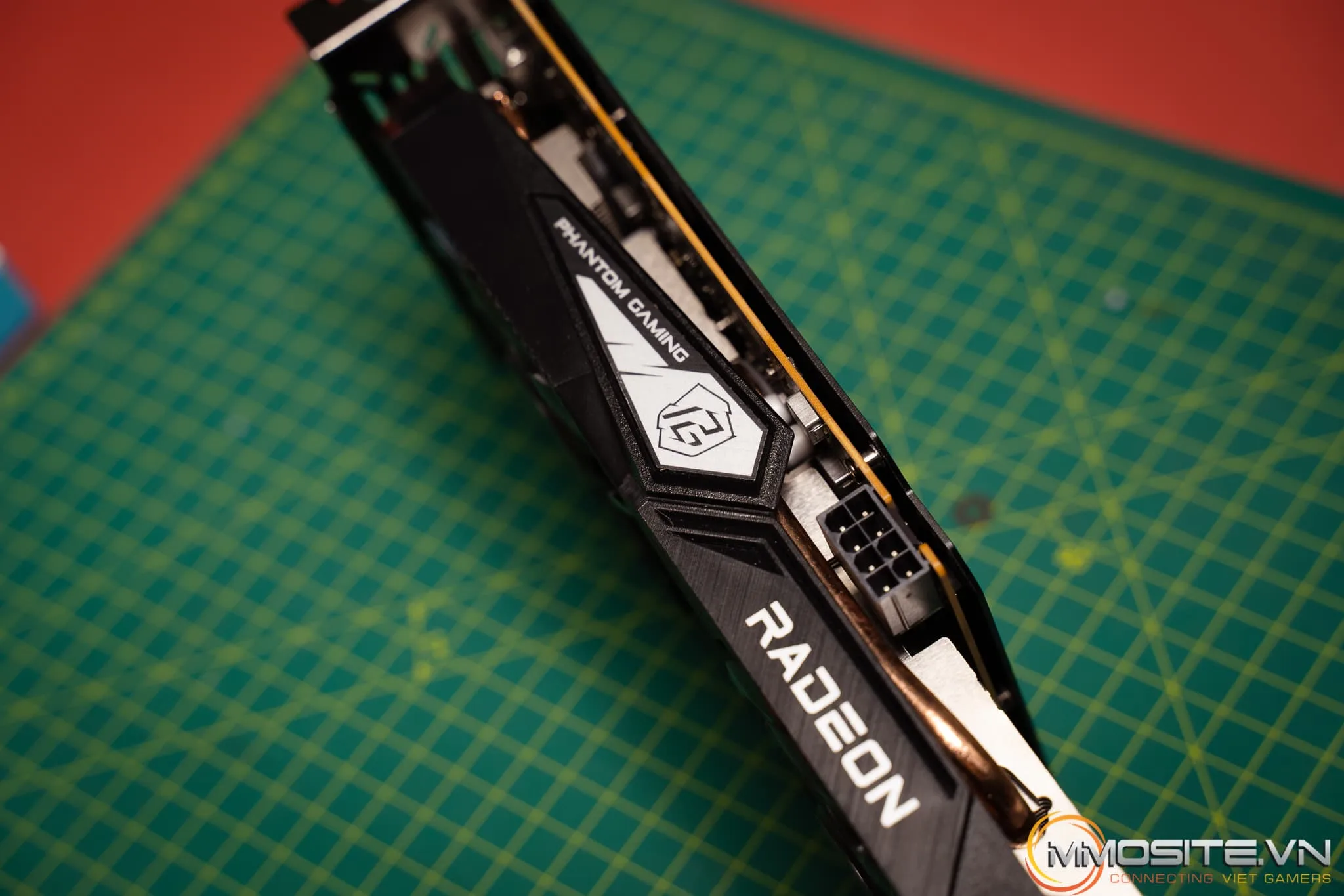 Di chuyển đến vị trí bên hông, vẫn là chủ đề Phantom Gaming xuất hiện tại đây. Bạn cũng sẽ thấy được rằng card đồ hoạ này sử dụng 8-pin nguồn. Tuy nhiên, do sử dụng bo mạch có kích thước ngắn nên vị trí gắn nguồn sẽ hơi bị lệch về phía trung tâm của thiết bị. Đây sẽ là một điểm trừ nhẹ cho phần thiết kế và setup.