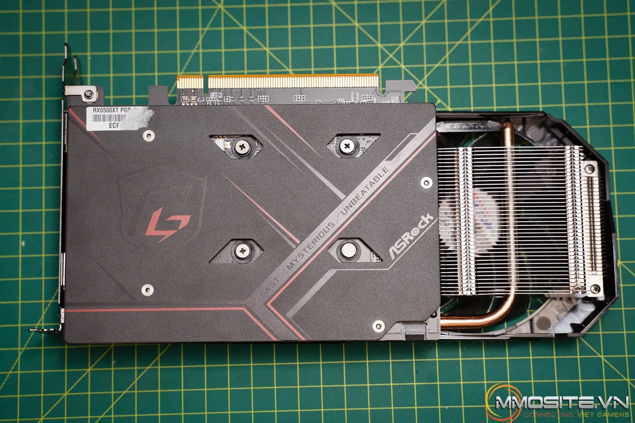 Ở vị trí mặt lưng, ASRock trang bị hẳn cho người dùng một tấm backplate bằng kim loại và được trang trí theo phong cách Phantom Gaming. Rõ ràng với một số thương hiệu khác, những chiếc card màn hình thuộc phân khúc phổ thông thường không có backplate hoặc được làm bằng nhựa mà thôi.