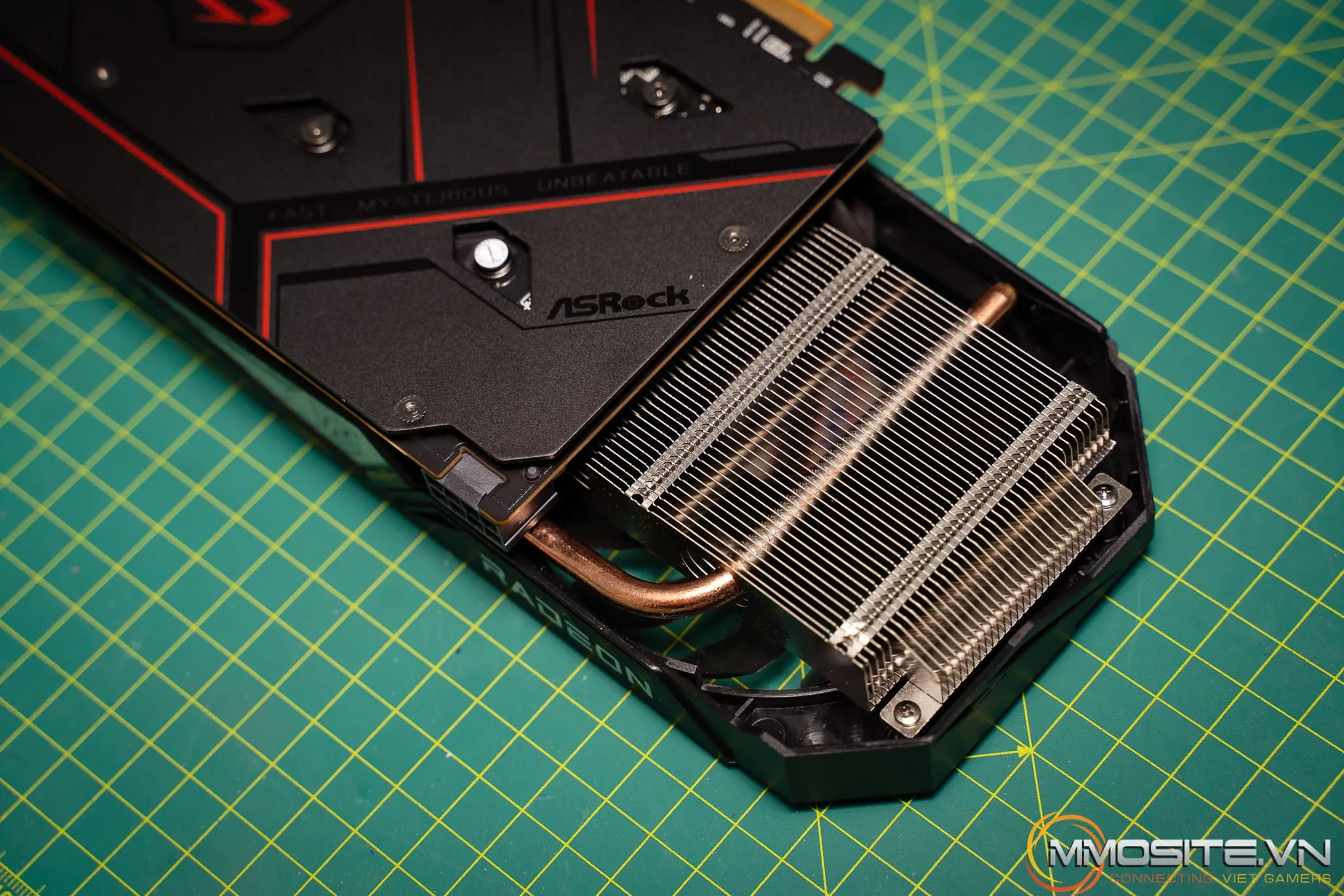 Tại đây bạn cũng có thể nhìn thấy rõ rằng bo mạch của card màn hình này khá ngắn, nhưng ASRock cũng đã trang bị một lớp lưới tản nhiệt dài hơn để có thể gắn được 2 bộ quạt đã nói ở trên. Việc này chắc chắn sẽ làm cho hiệu năng tăng cao hơn và tản nhiệt tốt hơn so với các mẫu card màn hình phổ thông chỉ có một quạt.