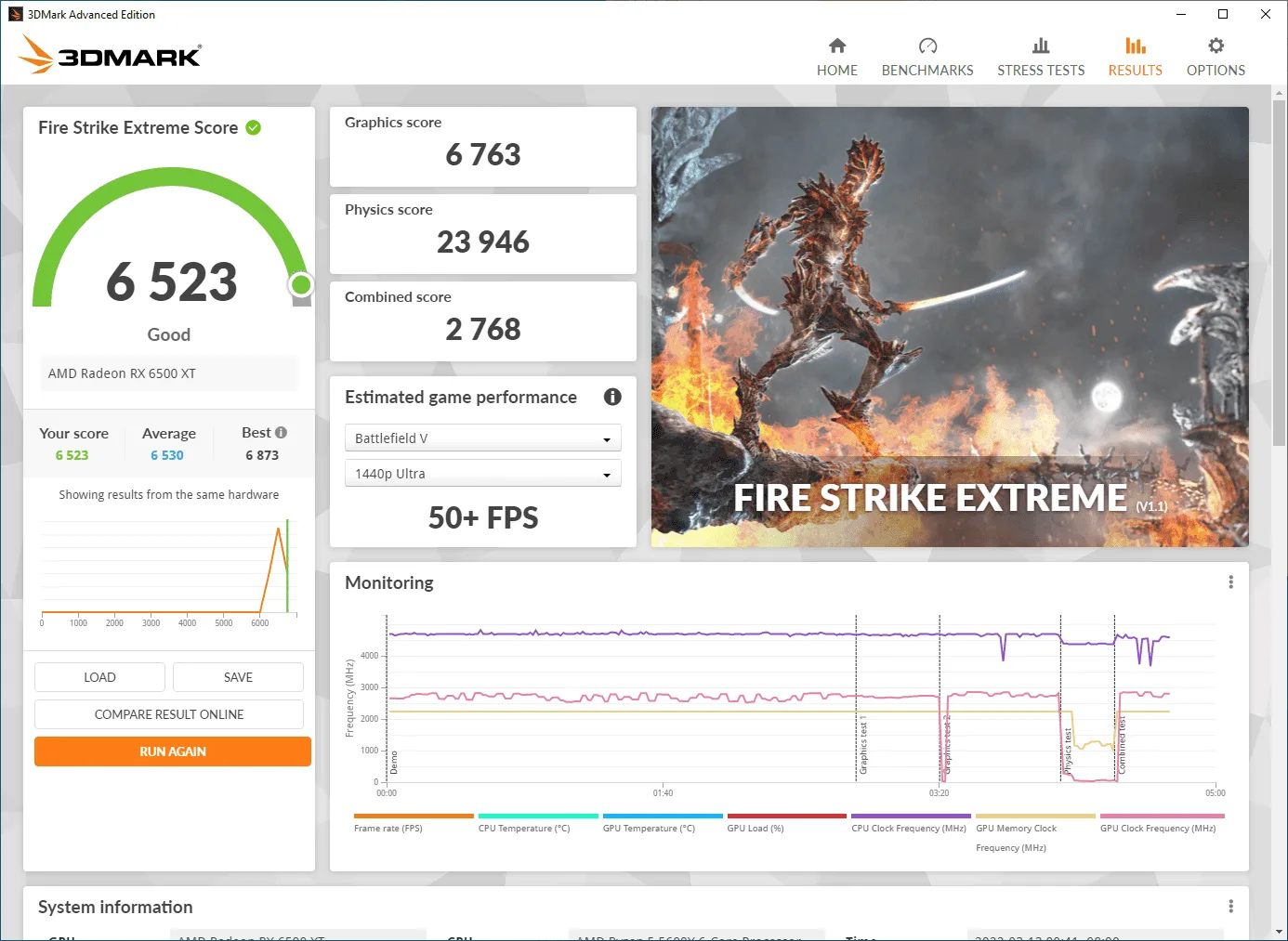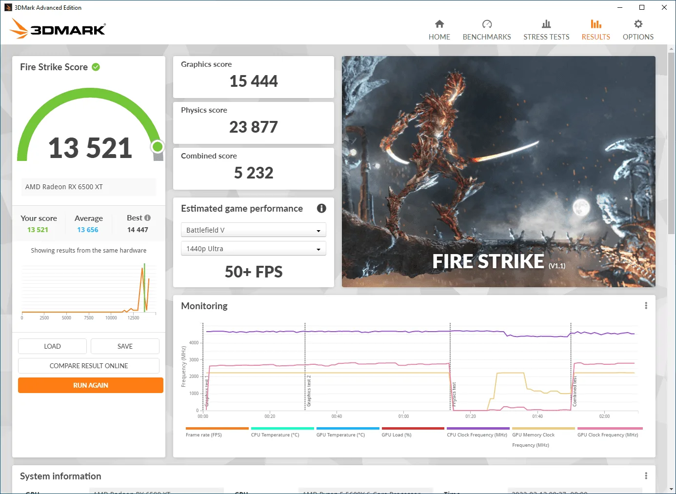 Đầu tiên, với phần mềm 3D Mark, bài test Fire Strike cơ bản cho điểm số tốt khi so sánh với các mẫu card màn hình phổ thông trước đây mà chúng tôi đã từng đánh giá. Số khung hình mà ASRock Rx 6500 XT đạt được cho bài test này rơi vào khoảng từ 60-70, khá ổn cho các game esports hay thậm chí là AAA. Tăng độ khó hơn một chút với Time Spy hay Fire Strike Extreme thì rõ rằng bạn sẽ thấy được giới hạn của mẫu card đồ hoạ này. Số khung hình bị giảm xuống khá nhiều. Vì thế, RX 6500 XT chỉ thật sự phù hợp cho độ phân giải Full HD.