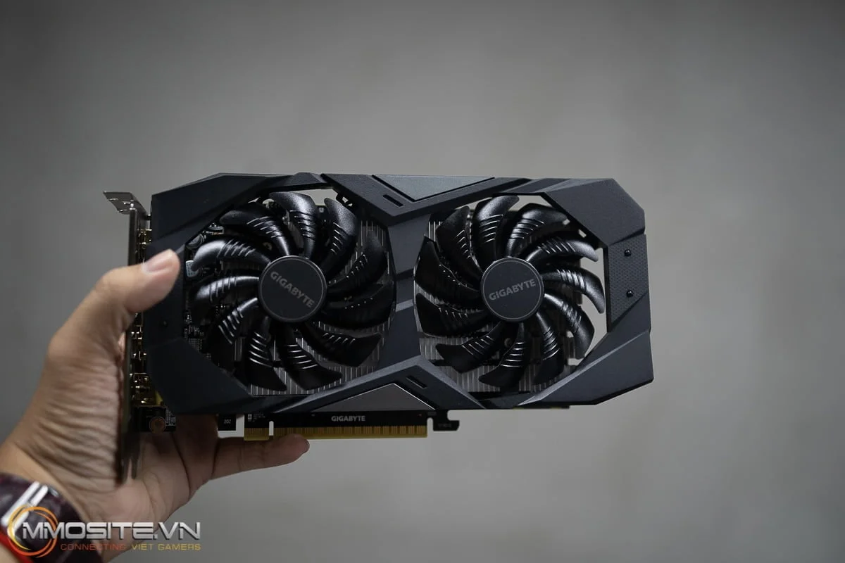 Ngay từ tên gọi, rõ ràng chúng ta không thấy được chữ AORUS trên sản phẩm này. Vì thế nên thiết kế và chất liệu của card đồ họa này sẽ tương tự như các phiên bản truyền thống. Gigabyte GTX 1650 trang bị 2 quạt 100mm có hướng ngược nhau, phía dưới là tấm tản nhiệt bằng nhôm. Thiết kế quạt quay ngược chiều nhau này sẽ giúp cho khí nóng được thoát ra nhanh hơn nhằm tăng hiệu năng. Chất liệu của lớp vỏ phía trước bằng nhựa nên tổng thể trọng lượng của card đồ họa này rất nhẹ.