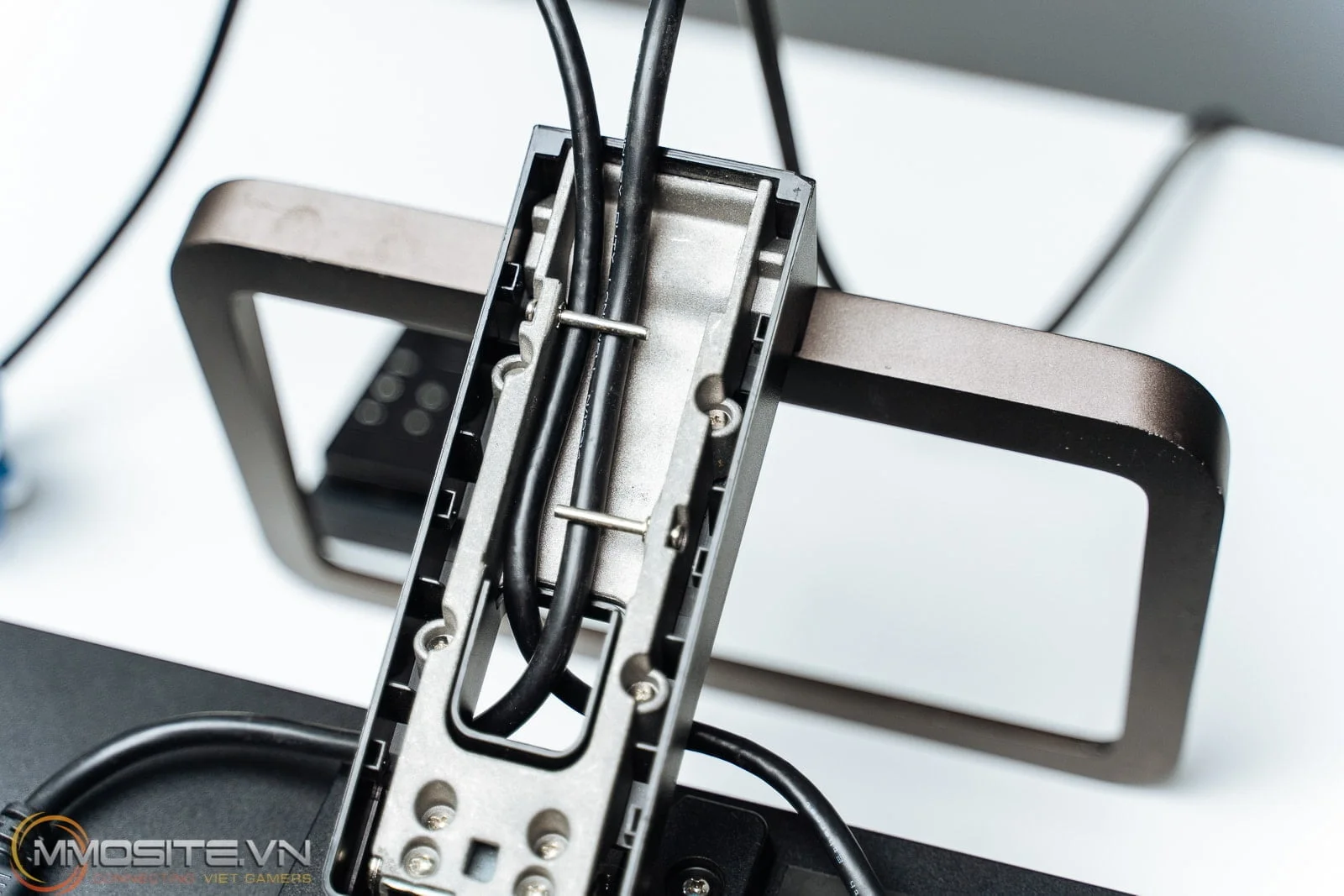 Chân đế được thiết kế theo phong cách đơn giản giúp giảm cảm giác nặng nề. Tuy nhỏ nhưng vẫn khá chắc chắn trong suốt quá trình sử dụng. Phía sau chân đế này cũng được thiết kế một hộc giấu dây giúp không gian trên bàn của bạn luôn được gọn gàng