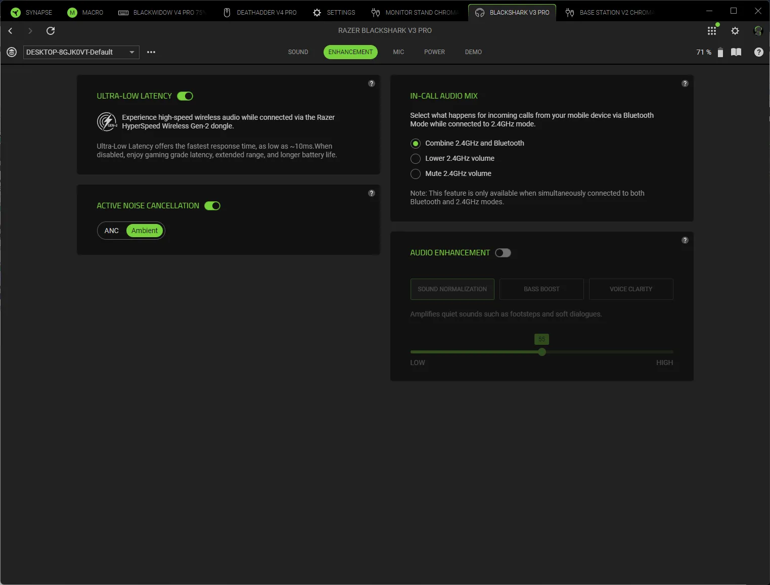 Phần mềm Synapse 4 và ứng dụng Razer Audio App cho phép đồng bộ và tinh chỉnh toàn diện. Người dùng BlackShark V3 Pro có thể dùng nhiều cấu hình EQ, tinh chỉnh mic, quản lý ANC và tuỳ chỉnh nút bấm.