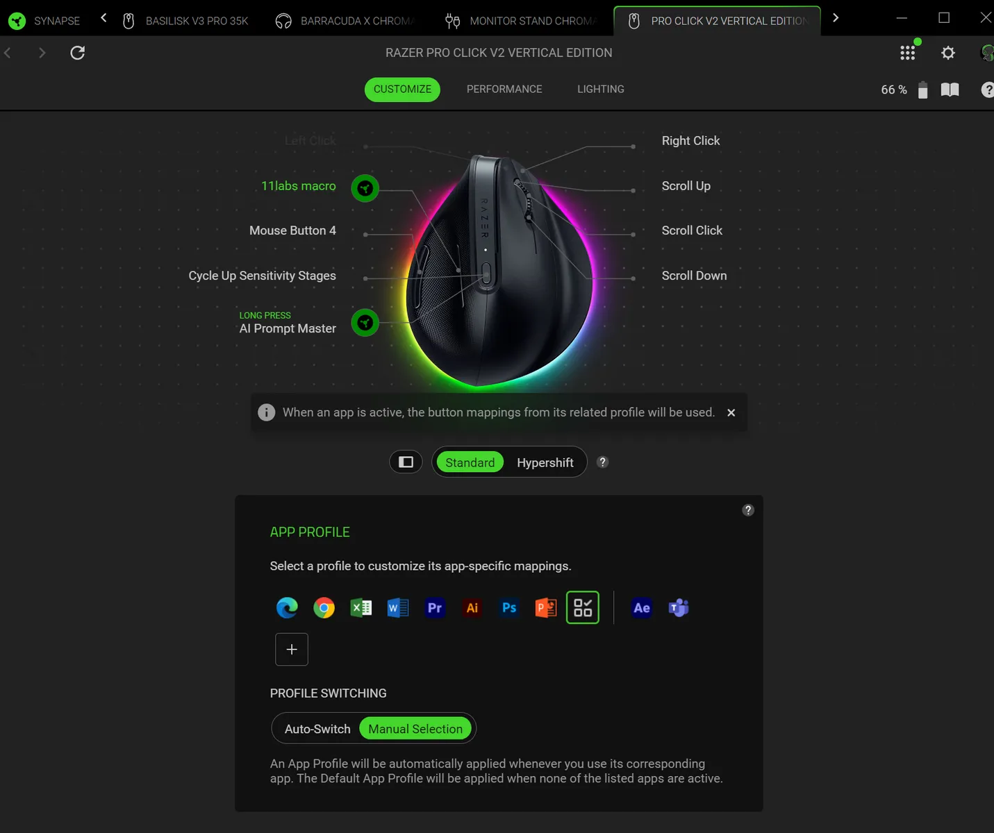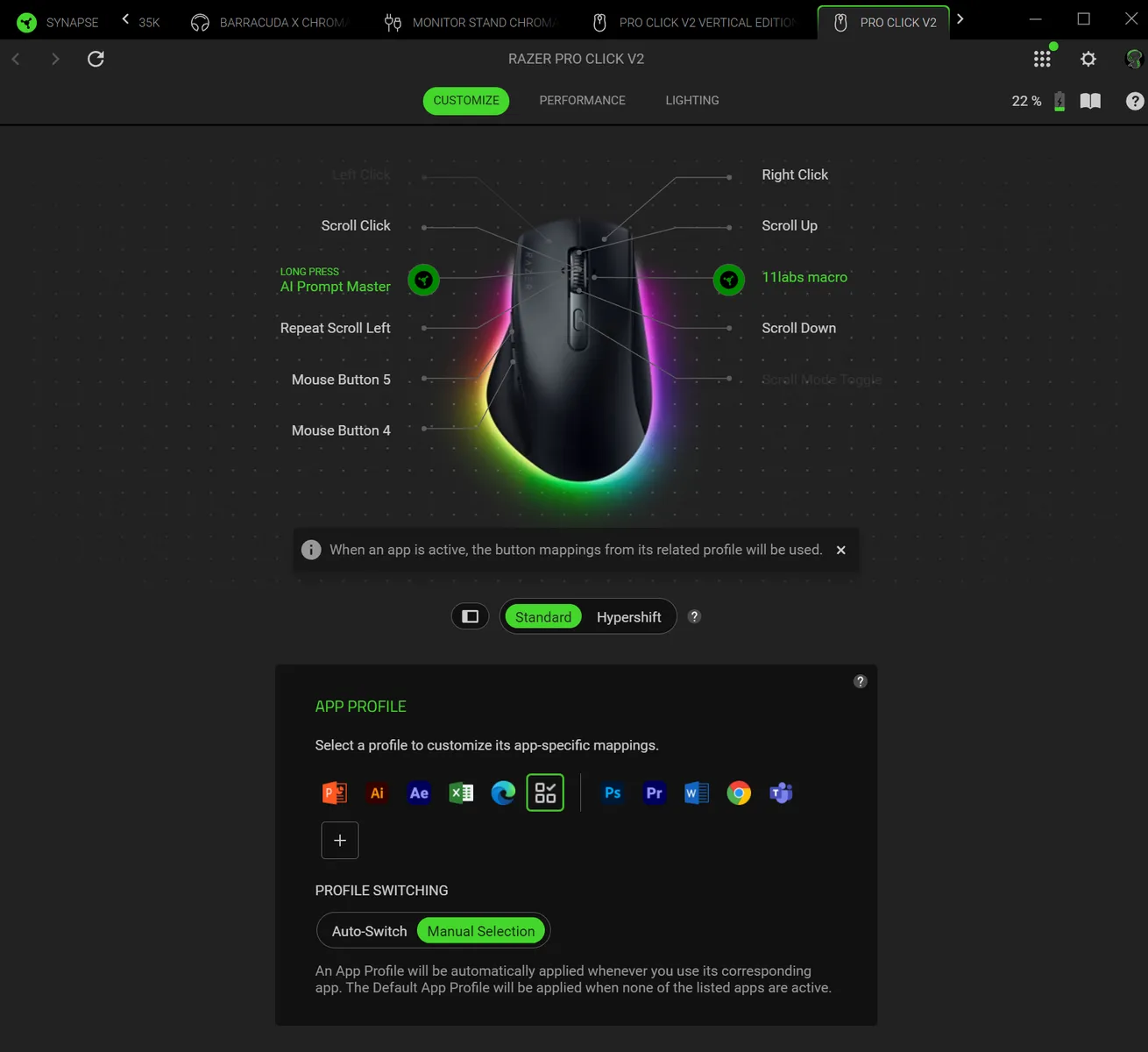Ngoài ra, Synapse hỗ trợ App Profile—cho phép tự động đổi thiết lập nút tùy theo ứng dụng đang dùng. Ví dụ, nút giữa có thể là AI Prompt trong Word nhưng sẽ là Play/Pause trong Premiere Pro. Với người dùng đa nhiệm và làm việc chuyên sâu trên nhiều phần mềm, đây là điểm lợi thế rõ ràng. Cuối cùng, hệ thống đèn RGB 14 hoặc 18 vùng hoàn toàn có thể tuỳ chỉnh qua Chroma Studio. Giao diện trực quan, hỗ trợ đồng bộ màu theo thiết bị, phần mềm hoặc trạng thái hệ thống