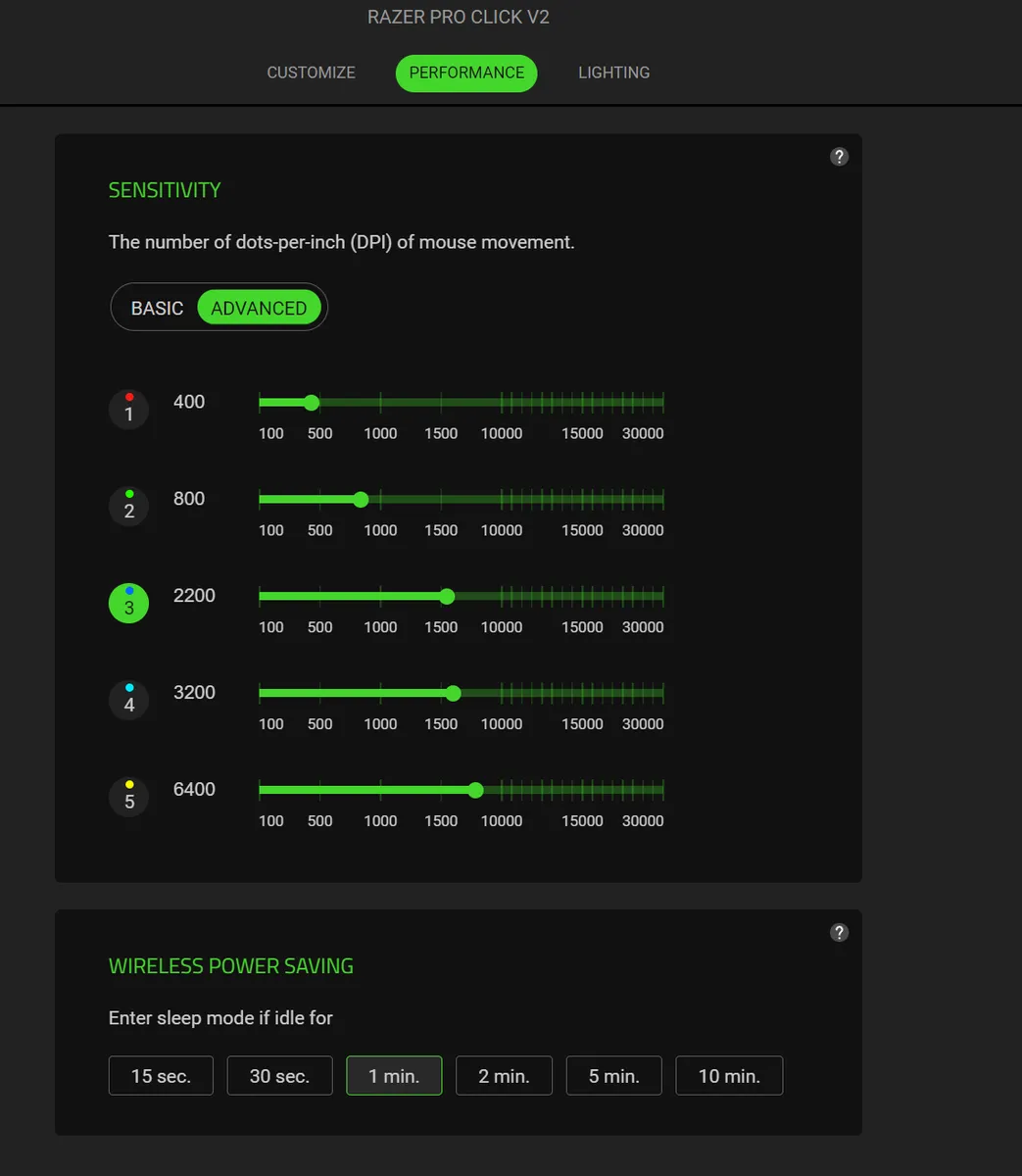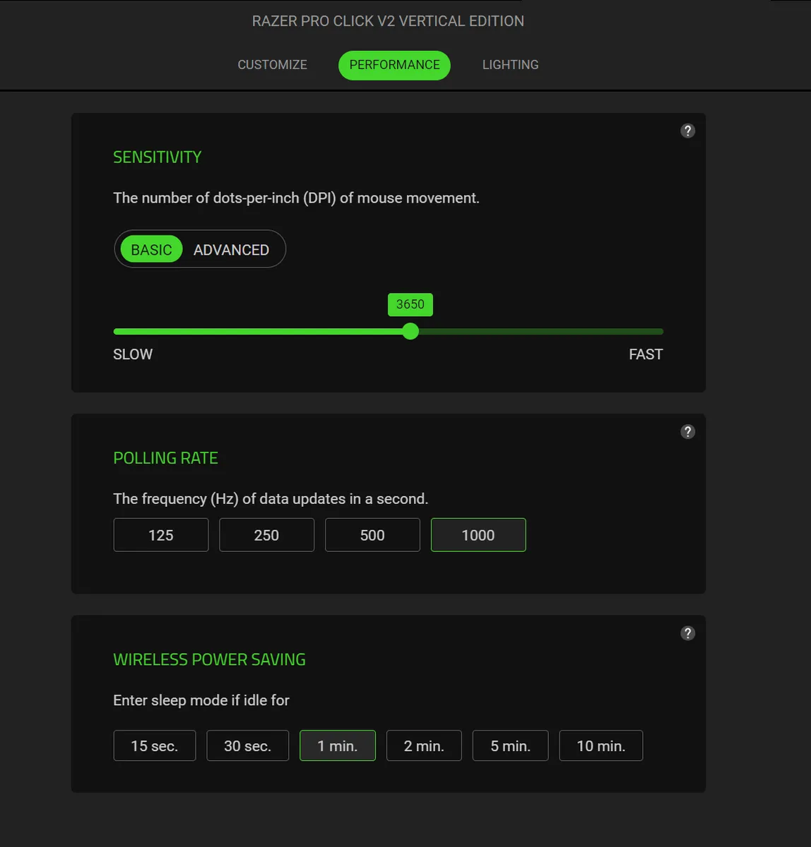 Một điểm cộng đáng chú ý nằm ở phần mềm Razer Synapse—trung tâm điều khiển toàn bộ hệ sinh thái thiết bị. Cả hai phiên bản chuột đều hỗ trợ điều chỉnh DPI theo bước 50 DPI, nhưng bản Pro Click V2 cho phép cấu hình chi tiết tới 5 mức DPI riêng biệt, dễ dàng chuyển đổi bằng phím tắt. Tab Performance của Pro Click V2 Vertical cũng hỗ trợ thay đổi polling rate từ 125Hz đến 1000Hz—phù hợp với cả môi trường văn phòng lẫn các tựa game yêu cầu phản hồi nhanh. Mục tiết kiệm năng lượng (Wireless Power Saving) cho phép tùy chỉnh thời gian ngủ tự động, hỗ trợ tối ưu thời lượng pin thực tế.