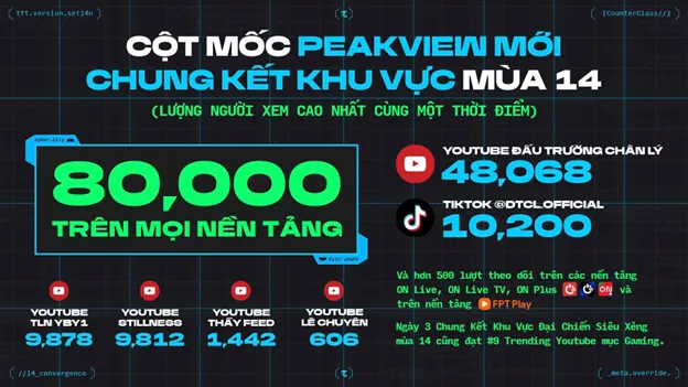 Ngoài ra, giải đấu Đại Chiến Siêu Xẻng APAC mùa 14 cũng ghi nhận cột mốc mới cho bộ môn thể thao điện tử Đấu Trường Chân Lý, với 80,000 lượt khán giả trực tiếp tính trên tất cả kênh phát sóng, tiếp tục cho thấy tiềm năng phát triển và sức hút mạnh mẽ của nội dung thi đấu này trên bình diện Châu Á – Thái Bình Dương.
