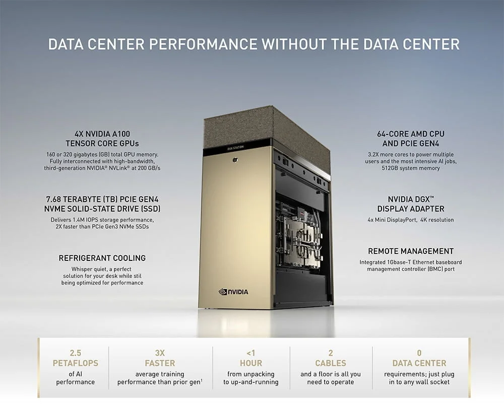 Được trang bị 4 GPU NVIDIA A100 kết nối với nhau thông qua giao thức NVLink tốt độ 200GB/s, kết hợp cùng CPU AMD EPYC 64 Core mới nhất, bộ nhớ 512GB DDR4, lưu trữ 7.68TB SSD chuẩn PCIe 4.0 và tat61 cả được làm mát bằng hệ thống tản nhiệt nước khép kín, DGX Station A100 thật sự là một siêu máy tính đúng nghĩa, nhưng nó cũng cực kì nhỏ gọn khi chỉ bằng case máy tính ATX thông thường (so với thế giới siêu máy tính) để có thể thành một node trong hệ thống siêu siêu máy tính.