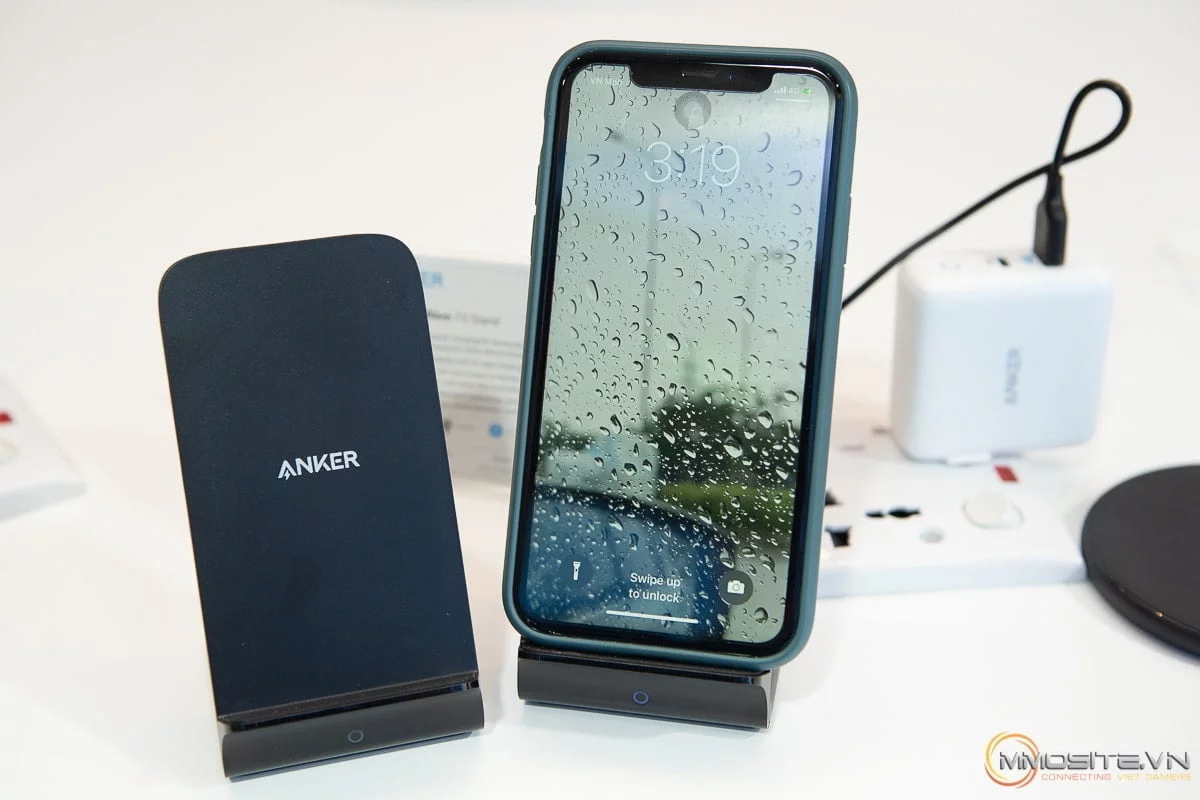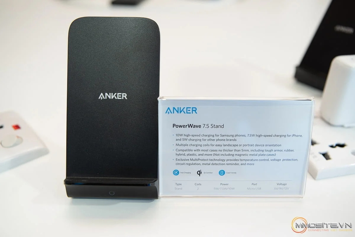 Tiếp theo, củ sạc và đế sạc không dây cũng được mang đến khá nhiều mẫu mã mới gọn gàng và đẹp mắt. Anker PowerWave là đế sạc không dây có khả năng xuất ra dòng diện 10W cho điện thoại Samsung và 7,5W cho iPhone giúp cải thiện thời gian sạc thông thường. Đế sạc này còn có khả năng sạc cho những điện thoại sử dụng ốp lưng có độ dày dưới 5mm.