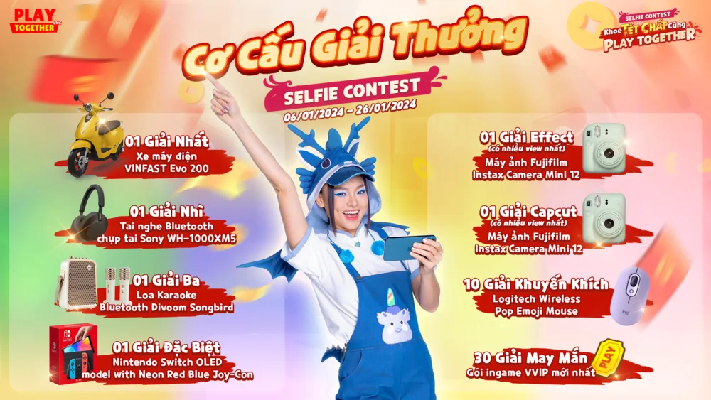 Được biết, giải thưởng cao nhất của cuộc thi Selfie contest – Khoe Tết chất cùng Play Together VNG là 01 xe máy điện Vinfast EVO 200; giải nhì là 01 tai nghe bluetooth chụp tai Sony WH-1000XM5; giải ba 01 Loa Karaoke Bluetooth Divoom Songbird; giải Khuyến khích là chuột máy tính Logitech Wireless Pop Emoji. Người chơi với “chất Tết” sáng tạo nhất sẽ nhận được giải đặc biệt – 01 máy chơi game Nintendo Switch OLED model kèm Neon Red Blue Joy-Con.