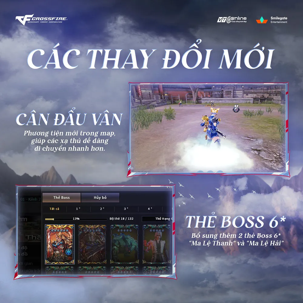 Bên cạnh đó chính ta sẽ có thêm nhân vật mới là Bạch Hồ, hệ thống di chuyển đặc biệt giúp bạn “bay” khắp bản đồ: Cân Đẩu Vân, Lam Long Vân, Kim Long Phi Vân… Ngoài ra còn có nhẫn dành riêng cho chế độ PVE là Ma Pháp Lam Giới, Ma Pháp Hải Giới. Các trang bị, vật phẩm theo chủ đề Phong Thần cũng sẽ được ra mắt.