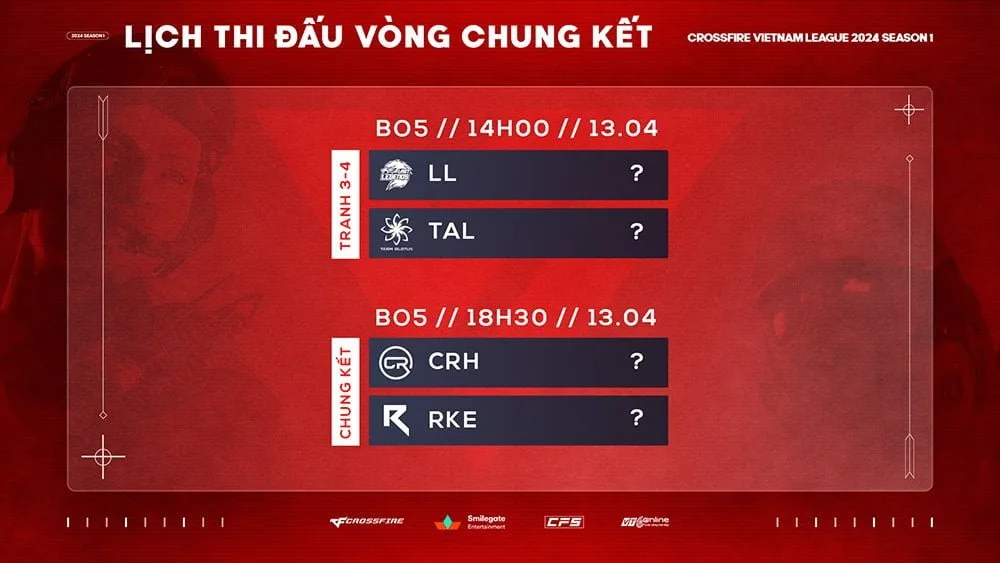 Ngày 13/04 sẽ diễn ra 2 trận đấu quyết định cuối cùng, CRH và RKE lại tiếp tục cuộc chiến tranh ngôi vô địch CFVL 2024 S1, LL và TAL sẽ có cuộc chiến tranh hạng 3-4 vào lúc 14h00.