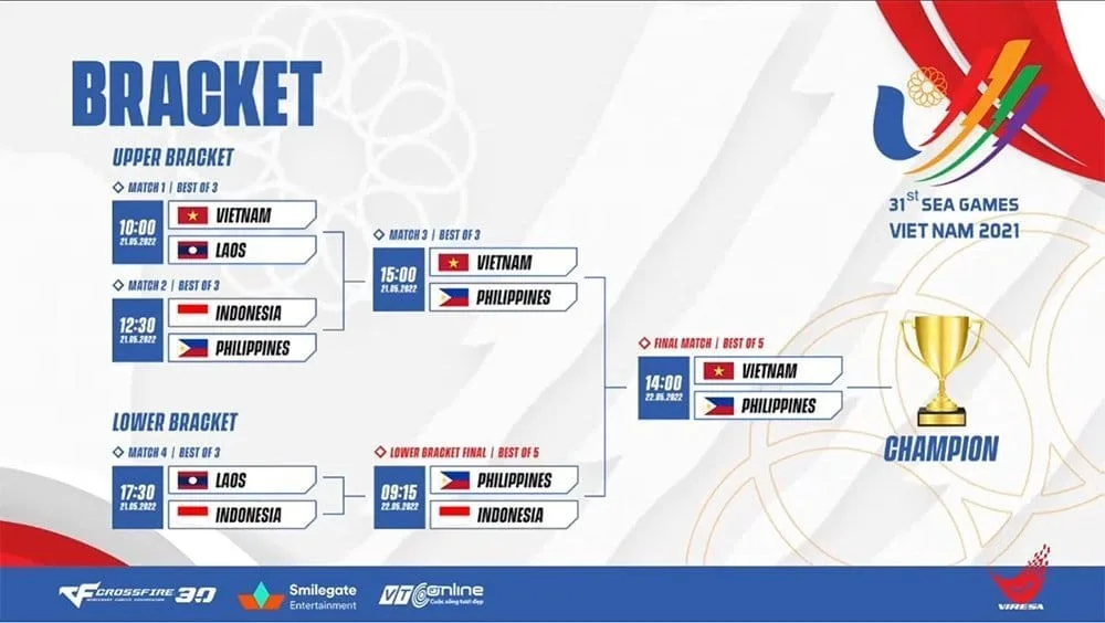 Mở đầu ngày thi đấu quyết định 22/5 là trận tái đấu rất được kỳ vọng giữa Indonesia và Philippines. Cả 2 đã gặp nhau ở trận đầu tiên của vòng loại vì vậy cả người xem lẫn Indonesia đều trông chờ vào một cuộc lật kèo. Tuy nhiên Philippines đã cho thấy họ hoàn toàn là một đội cứng cựa với pha hạ gục Indonesia lần thứ 2 giành vé vào chung kết. Indonesia sau trận thua quyết định với tỷ số lần lượt 2 – 10, 0 – 10, 6 – 10 đã nắm giữ hạng ba với huy chương đồng trong tay. Họ đã rất nỗ lực ở ván thứ 3 với hy vọng lật tỷ số về 2 – 1 nhưng đối thủ vẫn tỏ ra vượt trội hơn.