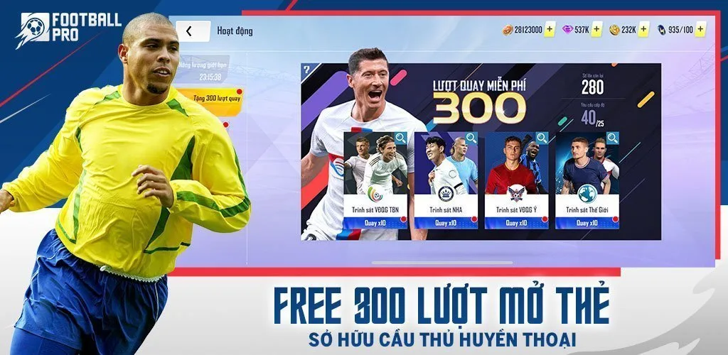 Game thủ có thể sưu tập được những cầu thủ xuất sắc nhất trong đội hình như Ronaldo de lima, David Beckham, Mbappé C, Ronaldo hay Messi….bằng việc chơi để sưu tầm các mảnh ghép hay quay thẻ may mắn, game thủ có cơ hội sở hữu trong đội hình những cầu thủ có giá trị cao lên đến tỷ đô.