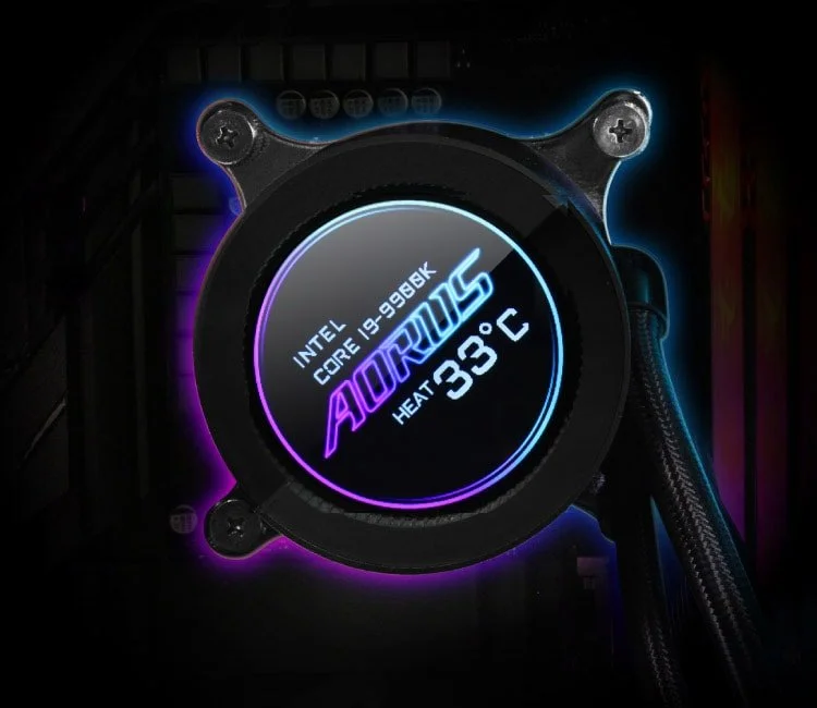 - Tích hợp màn hình trên block để thể hiện nhiệt độ theo thời gian thực. Nếu so sánh với sản phẩm tản nhiệt nước AIO của ASUS là ROG RYUJIN 360 hoặc ROG RYUO 240 sử dụng màn hình OLED có màu sắc “đầy đủ thì con hàng của GIGABYTE có vẻ kém miếng hơn khi chỉ sử dụng màn hình đơn sắc (Trắng) và dùng hiệu ứng dội ánh sáng từ LED Ring xung quanh để tạo màu.