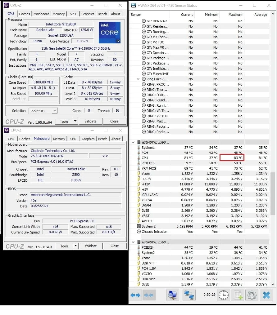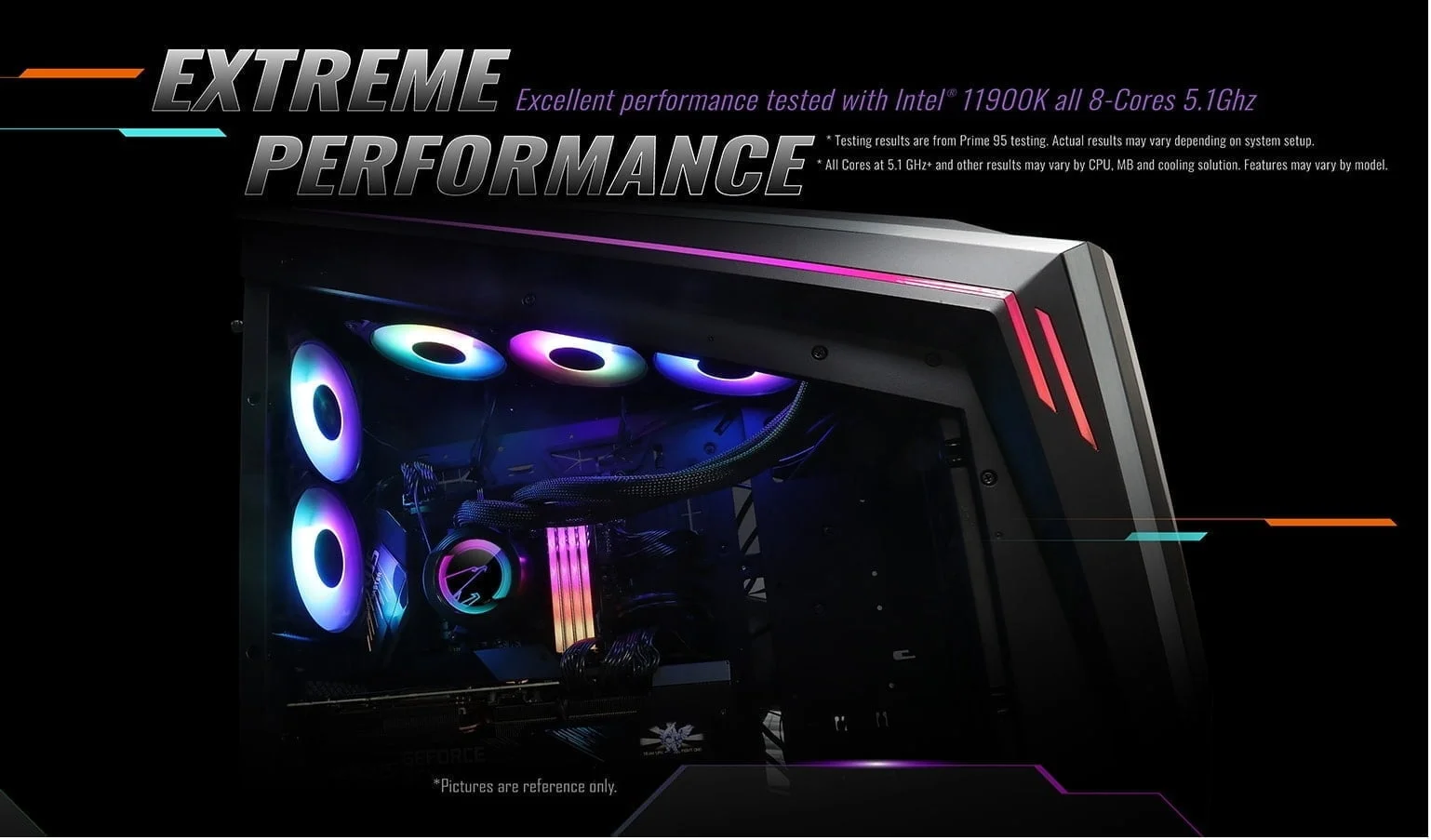 Trong thử nghiệm thực tế đối với stress app Prime95 non AVX, ngay cả bộ xử lý Intel® Core™ i9-11900K TDP cao 125W cũng có thể chạy tất cả các lõi ở tốc độ 5,1 GHz trên 8 lõi ghép nối với AORUS WATERFORCE 240. Điều này chứng tỏ hiệu suất cao cấp của AORUS WATERFORCE SERIES từ GIGABYTE.