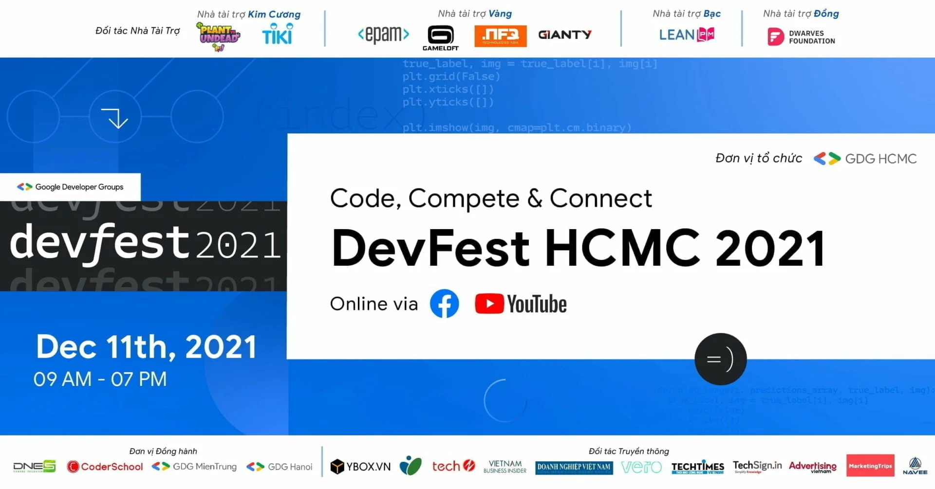 Vào ngày 11 tháng 12 năm 2021, Google Developers Group DevFest HCMC 2021 – Kỳ hội Học hỏi, Tranh tài và Kết nối sẽ được tổ chức dưới hình thức trực tuyến. Chương trình dự kiến thu hút hơn 10.000 lượt tham dự của các lập trình viên đến từ các tổ chức, công ty công nghệ và sinh viên ngành CNTT trên khắp cả nước.