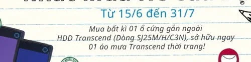 Theo đó, từ ngày 15/06/2017 đến ngày 31/07/2017, khi mua bất kỳ ổ cứng của Transcend có dung lượng 1TB trở lên, người dùng sẽ nhận được một áo mưa thời trang và tiện lợi.