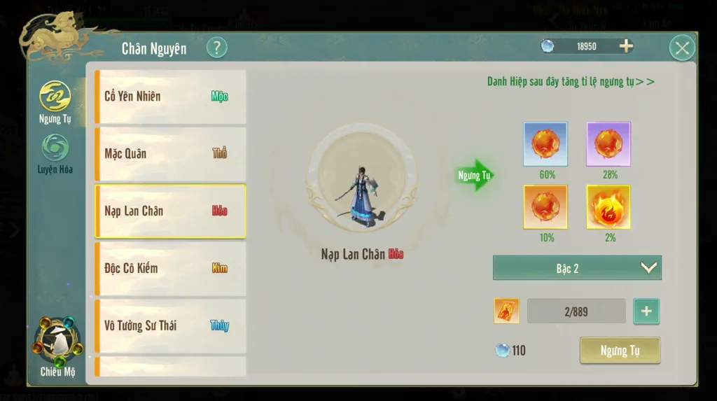 Chân Nguyên là một loại trang bị đặc biệt có thể thăng cấp, luyện hóa, giao dịch. Chân Nguyên có thể được Ngưng Tự từ Đồng Hành, sau khi Ngưng Tụ sẽ nhận được Chân Nguyên Hỗn Độn. Vật phẩm này sẽ giúp tăng các chỉ số nhất định cho nhân vật, trang bị đủ 5 Chân Nguyên Hỗ Độn theo ngũ hành để kích hoạt hiệu quả đặc biệt.