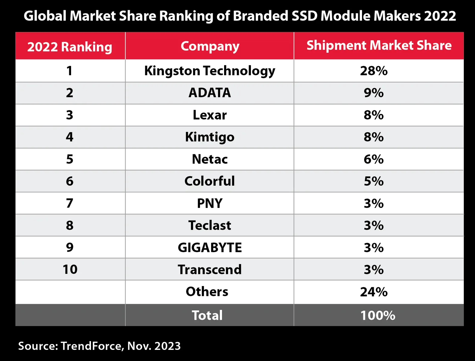 Ngay cả khi phải đối mặt với những thách thức từ thị trường, top năm nhà sản xuất bên thứ ba hàng đầu (không phải là bán dẫn) chiếm gần 60% tổng lượng vận chuyển trong năm 2022. Với kết quả trên, Kingston lần nữa khẳng định vị thế của mình là nhà sản xuất SSD hàng đầu, khi nhà cung cấp hạng hai chỉ chiếm 9% trên tổng thị trường.